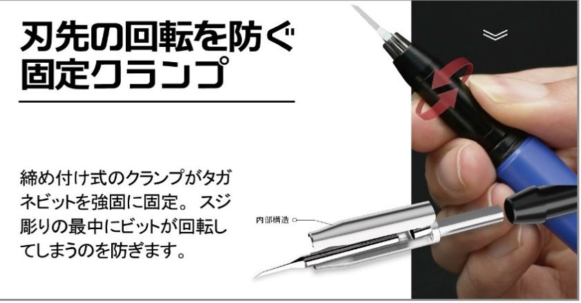 締め付け式のクランプがビットを強固に固定。作業中のビットの回転を防ぎます。
