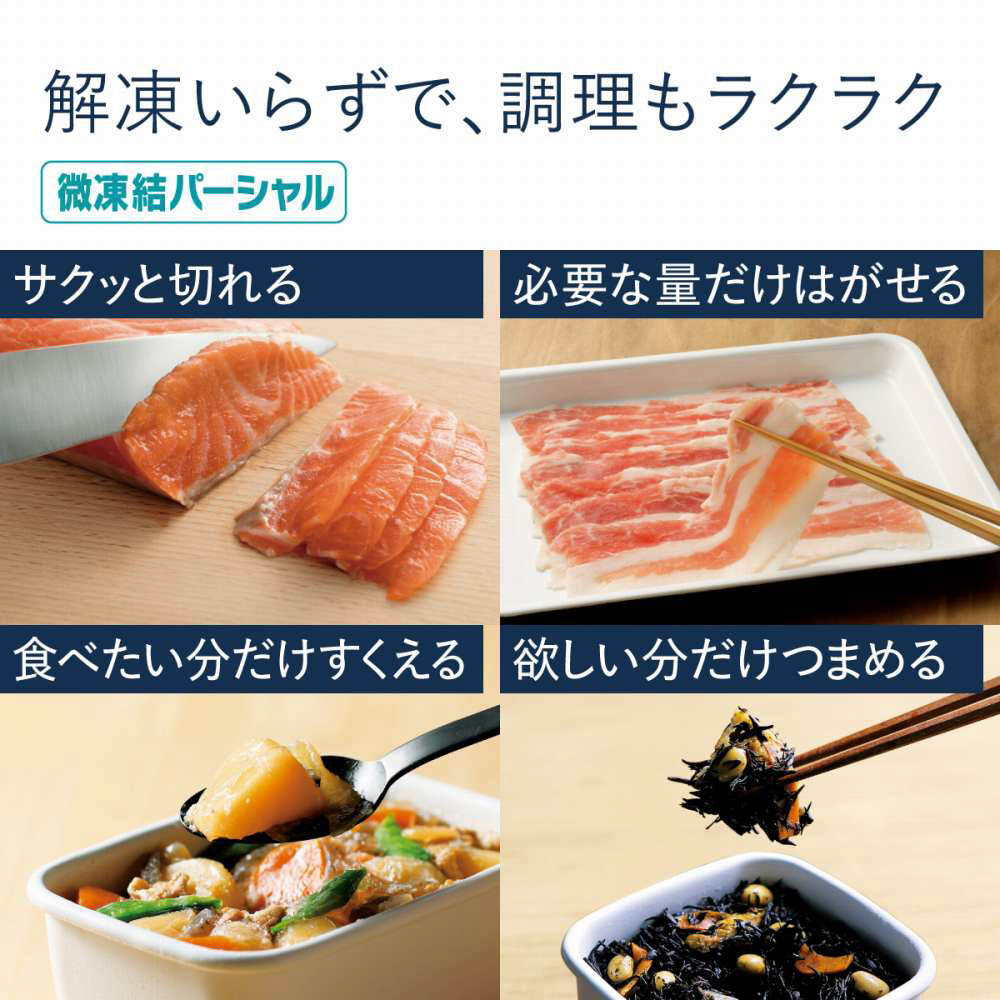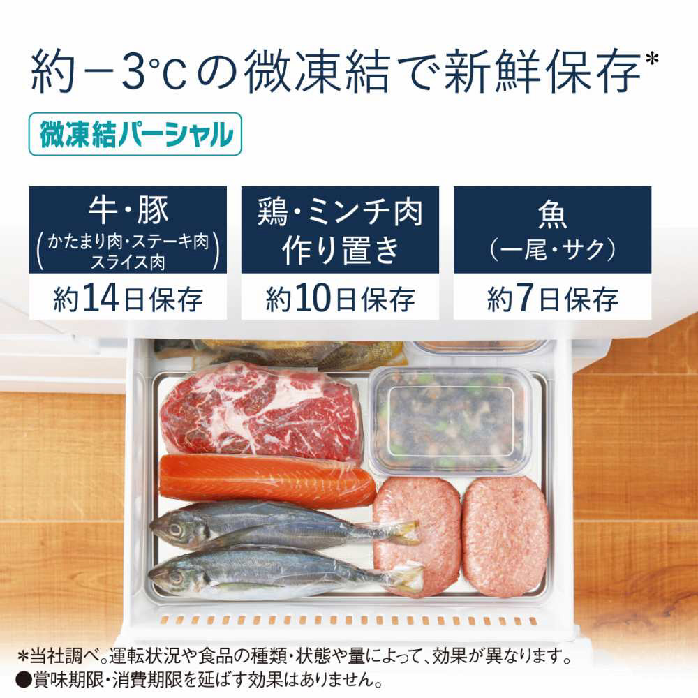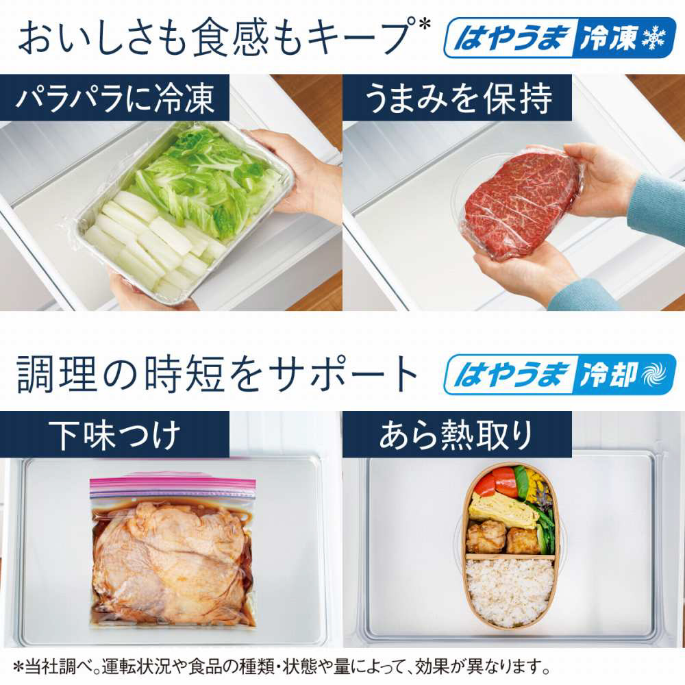 加湿し、うるおい保存ができる野菜室を真ん中にレイアウト。冷凍室に、食品の霜つき・乾燥を抑える「うまもり保存」を新搭載。