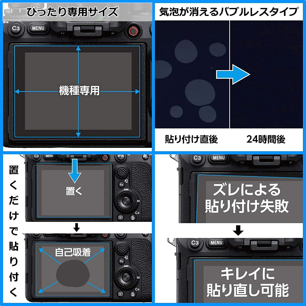 シリコン粘着層の自己吸着性により、フィルムを画面に置くだけで自然に貼り付くため貼り付けが簡単です。