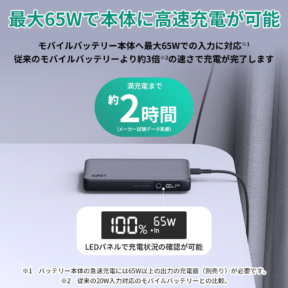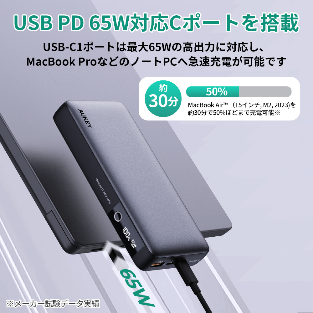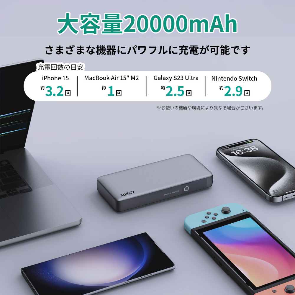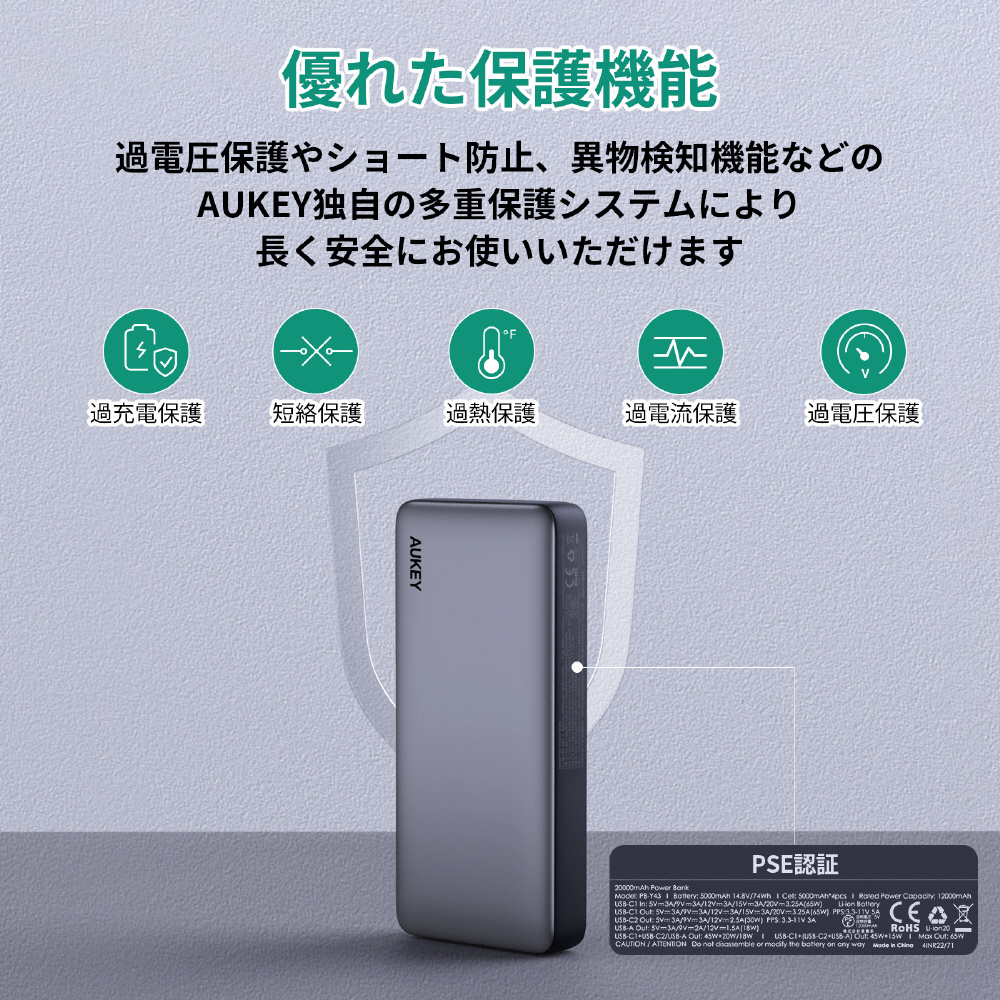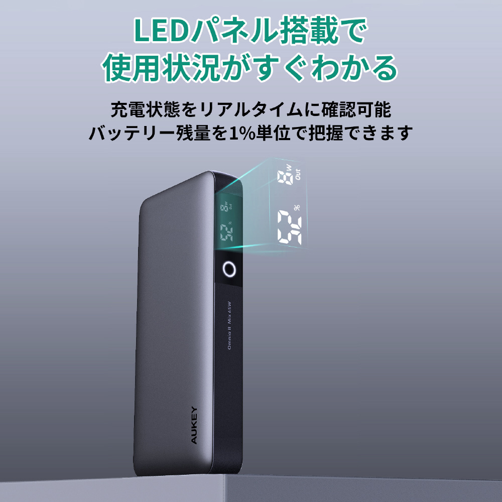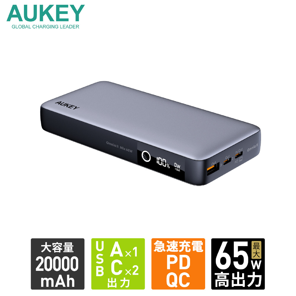AUKEY(オーキー) モバイルバッテリー Sprint X 20000mAh PD対応 65W [USB-A 1ポート/USB-C 2ポート]出力 [USB-C 1ポート]入力 グレー AUKEY(オーキー) Gray PB-Y43-GY