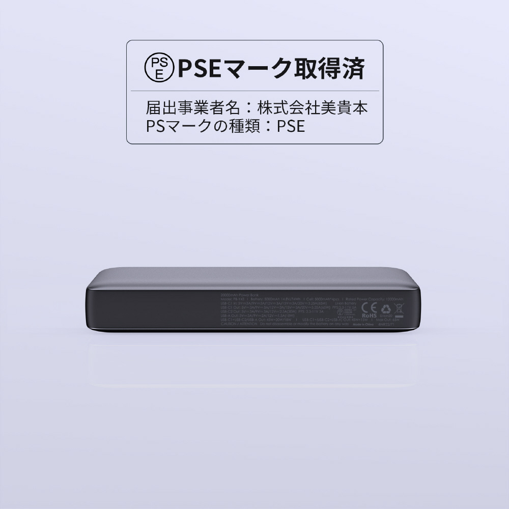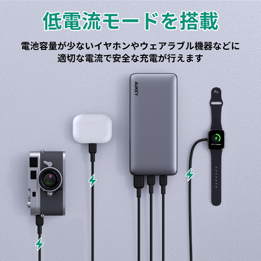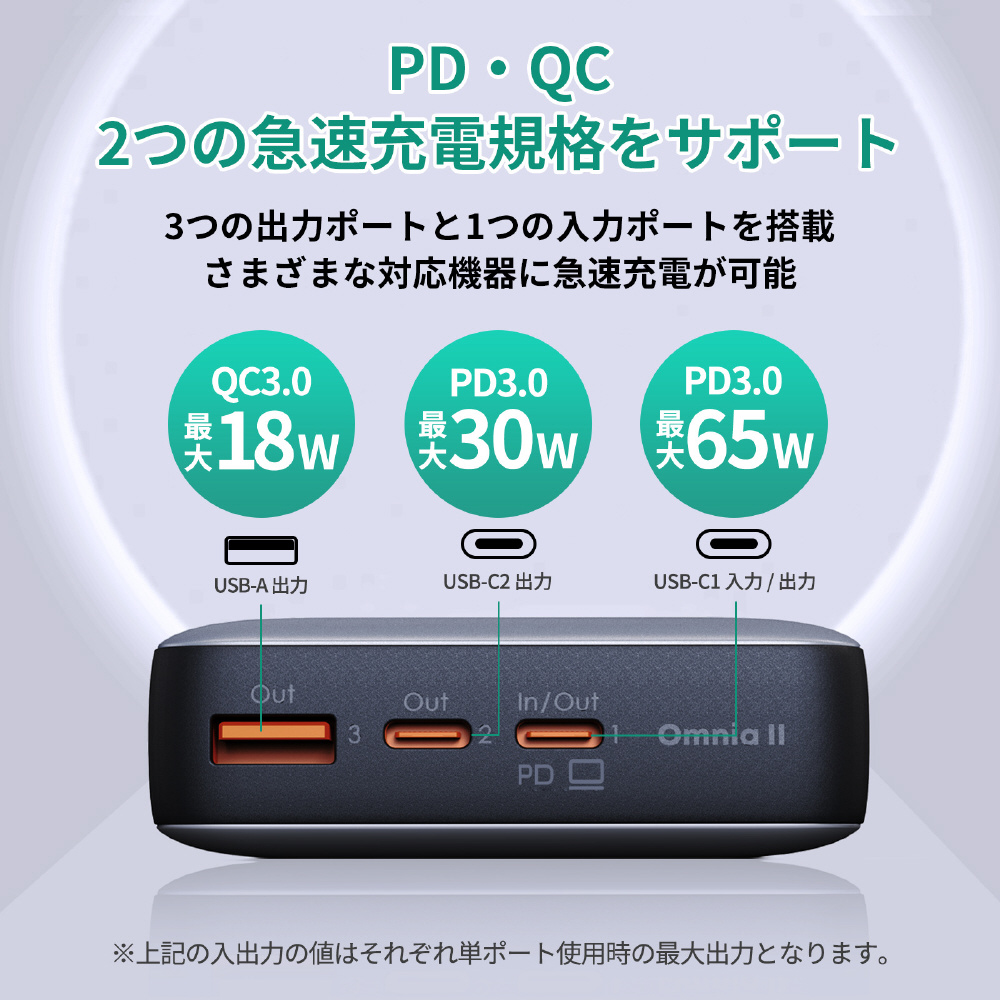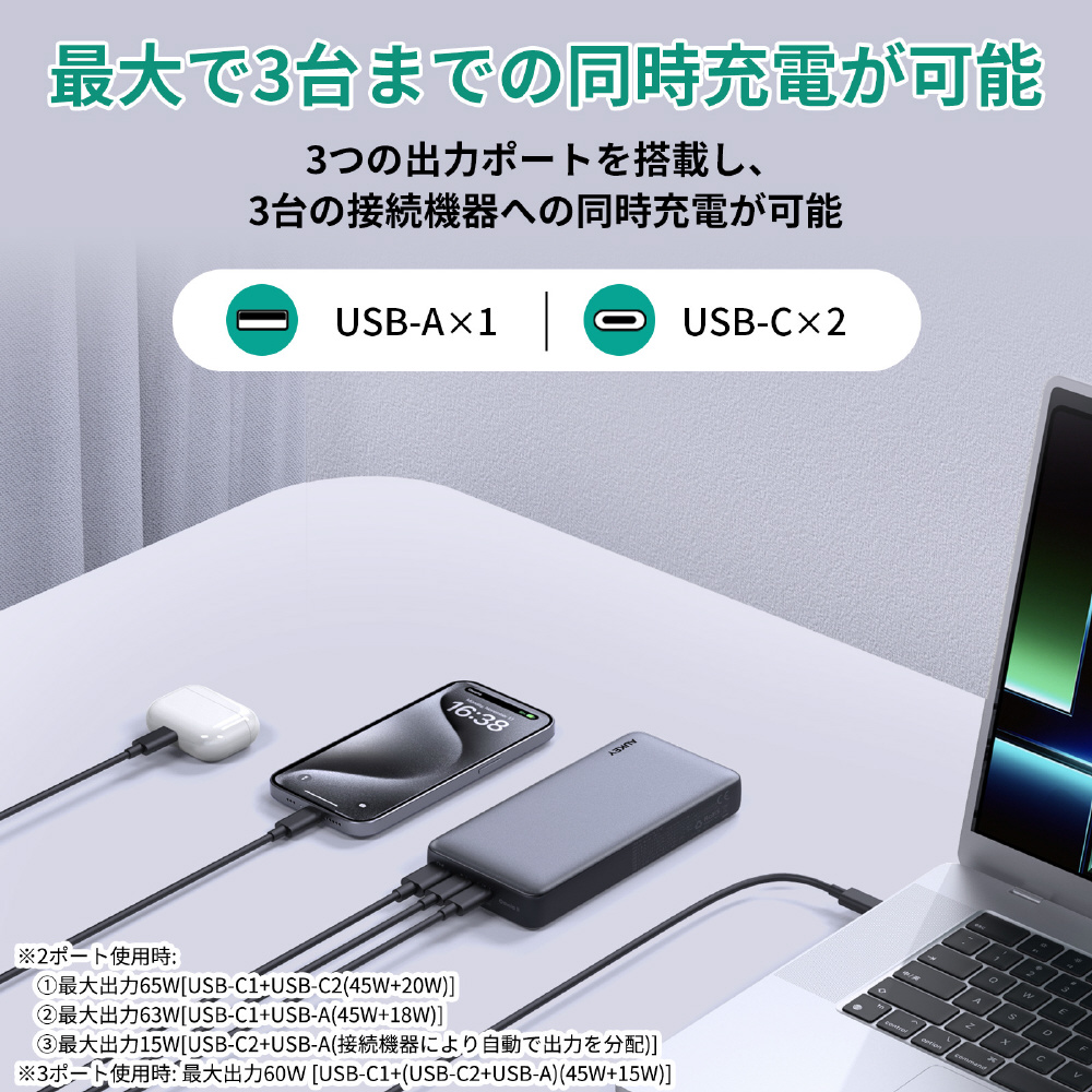 20000mAhの大容量で、最新のiPhoneシリーズにも約3〜4回の充電が可能です。2つのUSB-Cポートと1つのUSB-Aポートの合計3ポートを搭載。USB-Cポートは最大65W PDをサポートし、ノートPCの急速充電もおこなえます。
