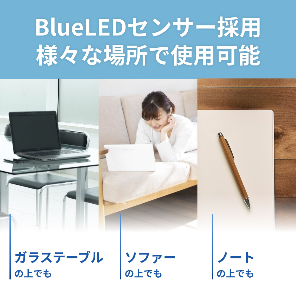 青色LEDの放つ光は、赤や緑の光に比べて波長が短く、空気中の分子にぶつかりやすい為、反射率&拡散率が高く、僅かなホコリや凹凸を照らし出すことが可能です。従来のマウスでは難しかったガラスや透明シートの上でも、マウスの動作を正確に読み取ることを可能にしました。(※)