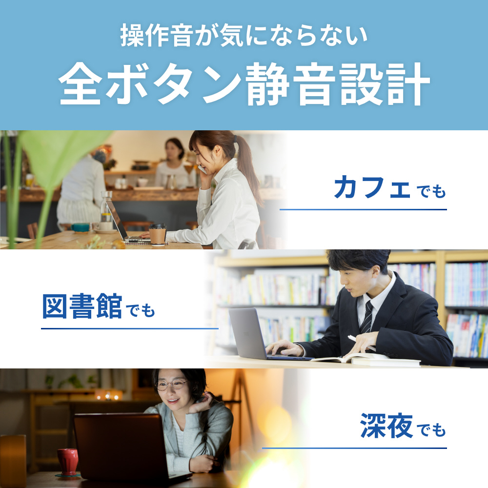 会議中、夜中、カフェなどで周囲を気にせずに使用できます。