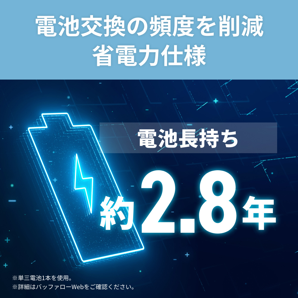 低消費電カモードでの通信を行い、わずかな電力で操作できるため約2.8年の電池寿命を実現※2。電池交換の頻度が減らせます。