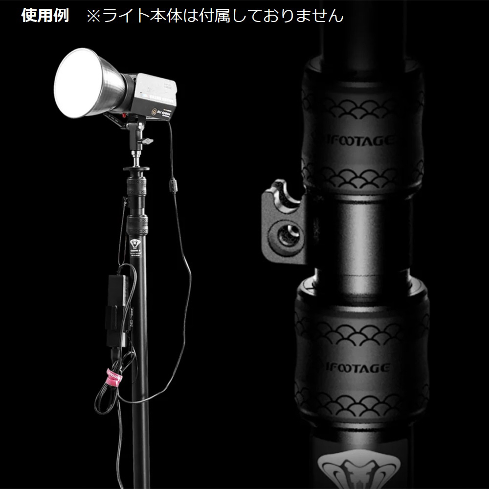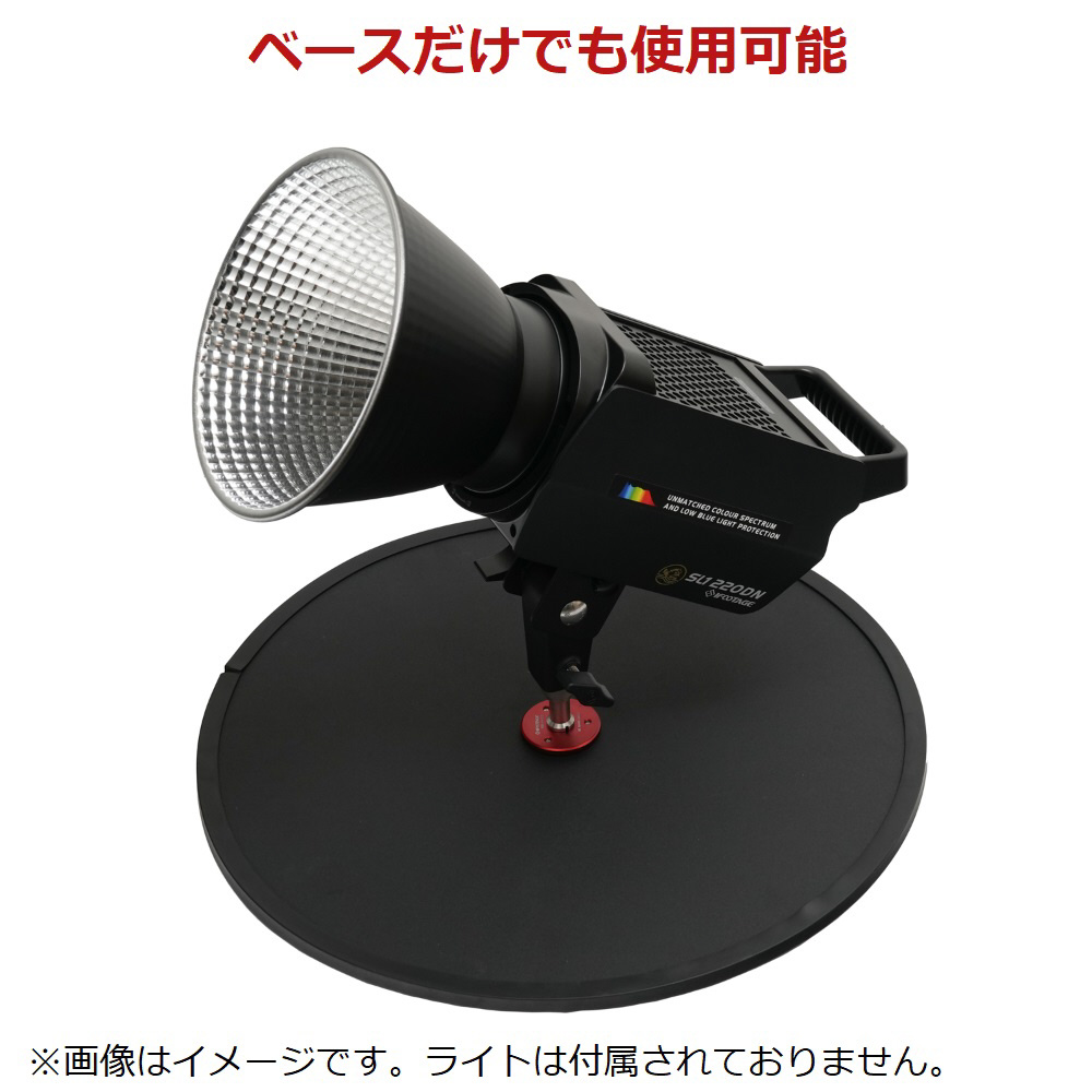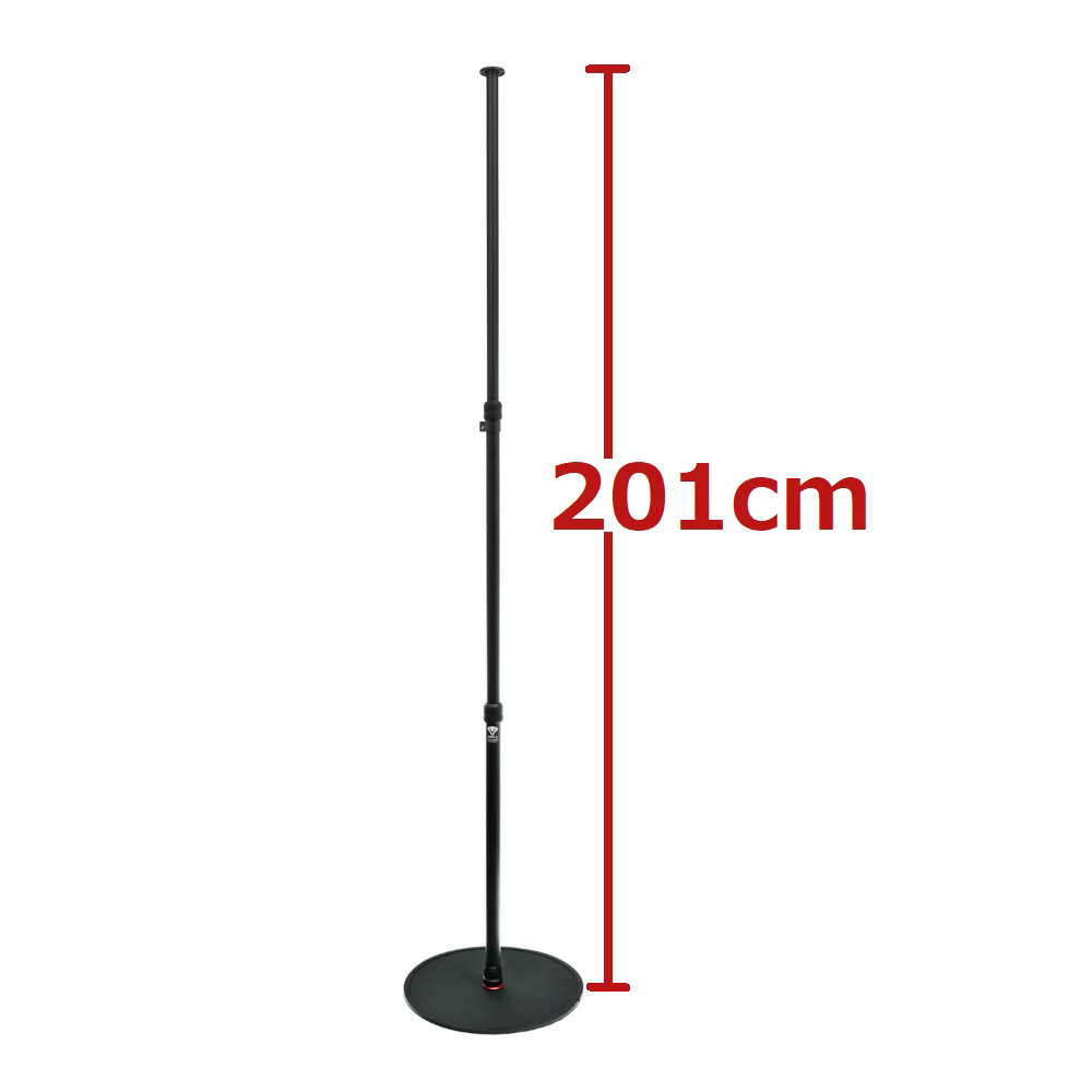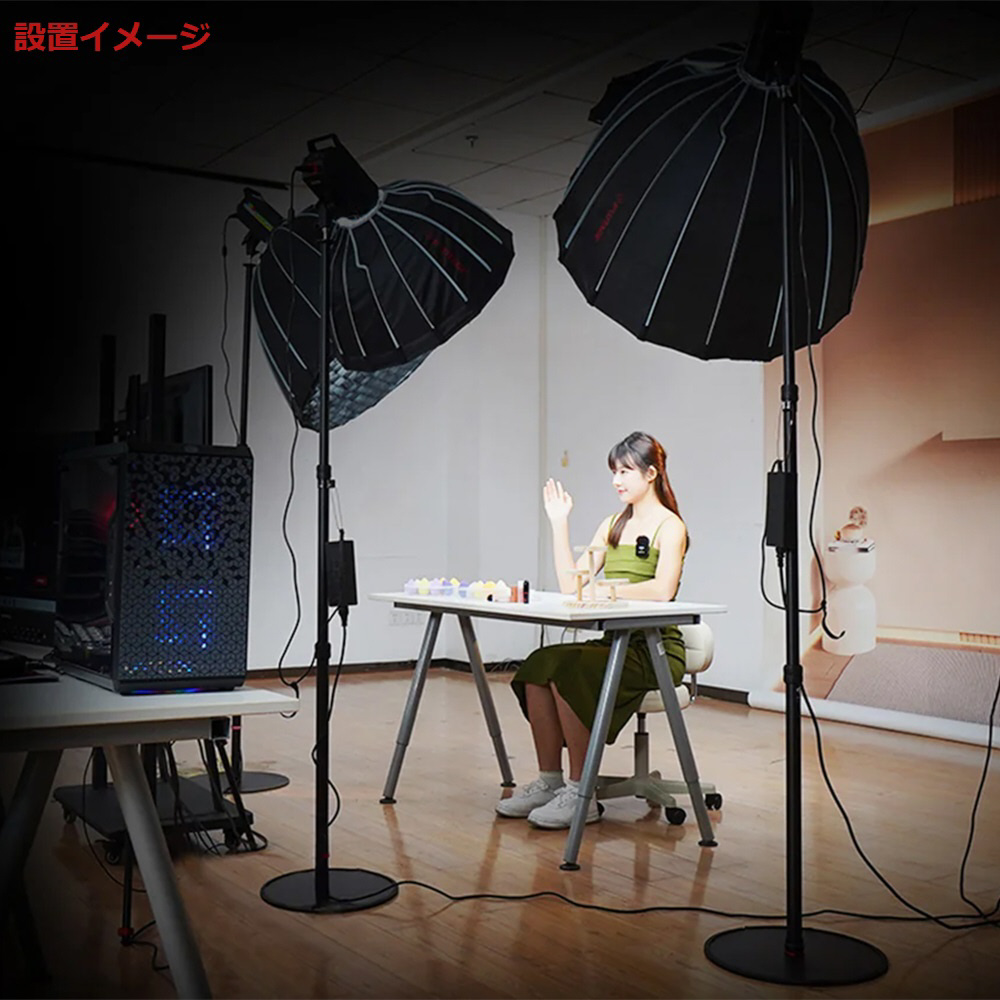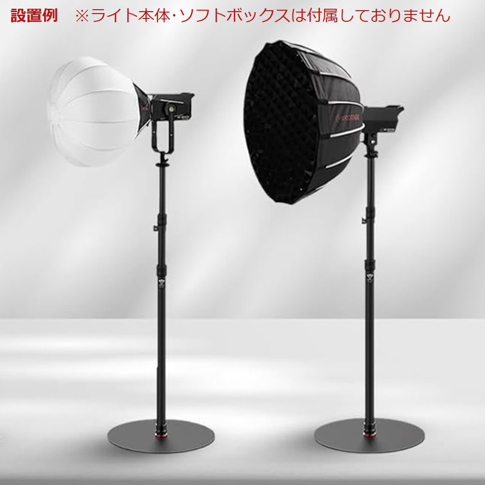 最大201cmまで伸ばせるライトスタンドです。直径40cmの金属製フラットベースのため、しっかりとパイプを支えながら、省スペースの設置を実現しました。10kgまでの高耐荷重で大型のライトや雲台、カメラまで3/8インチネジ対応のあらゆる機材が搭載可能です。