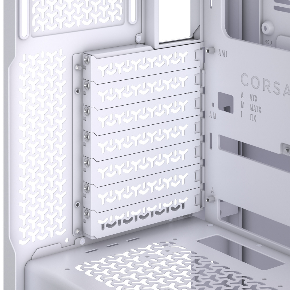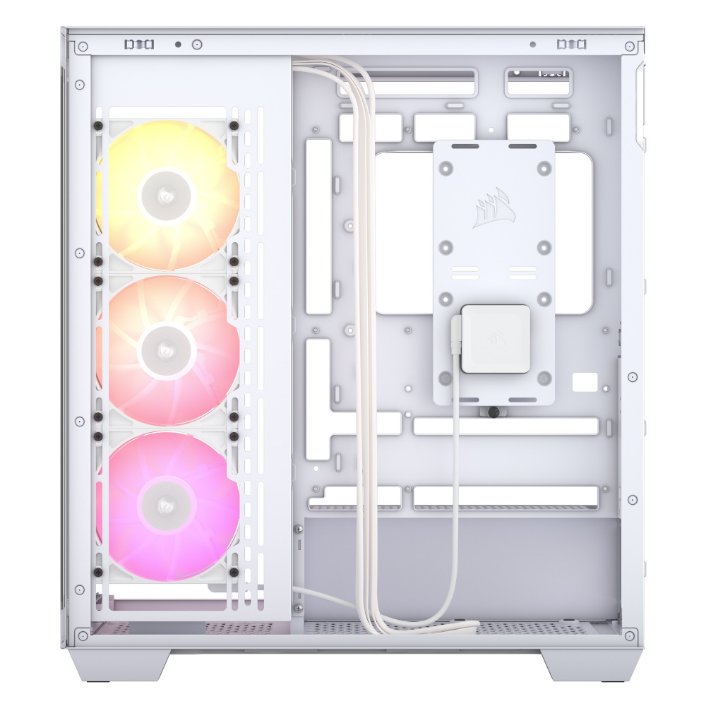 ドレスアップを楽しめるピラーレスデザインを採用。背面コネクタ設計のマザーボードに対応し、iCUE LINKファンを備えるミドルタワー型PCケース