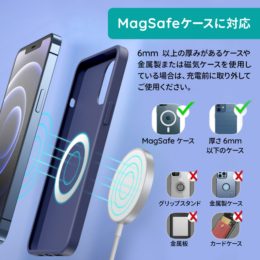 16個強力磁気で吸着して、スマホを落ちる心配はいりません。ケースをつけたままでも充電ができるように設計されています。ただし、約6mm以上の厚みがあるケース、金属製や磁気ケース、およびクレジットカードなどは、充電前に取り外してください。