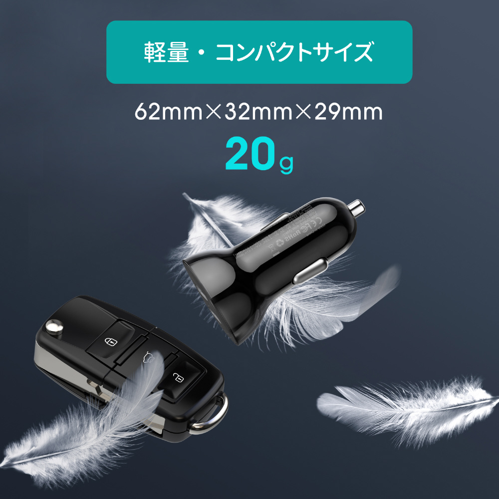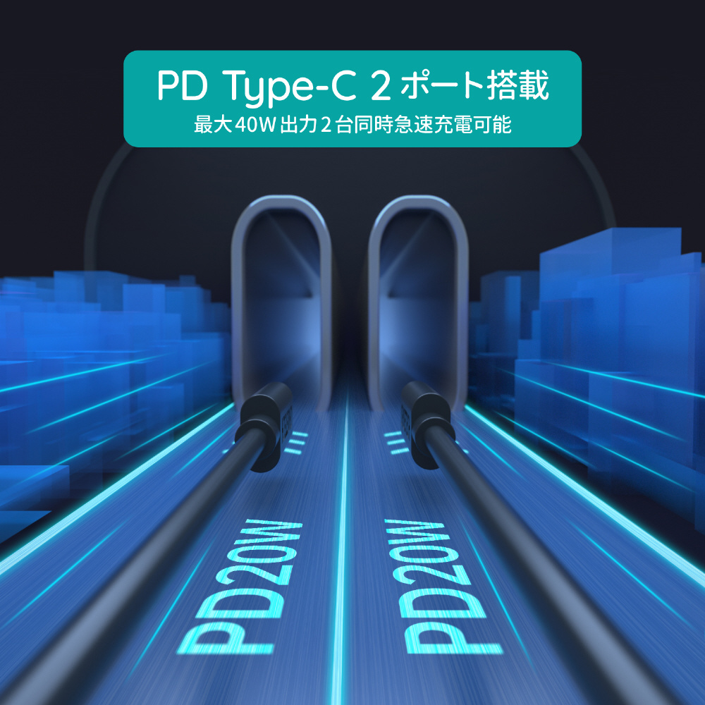 このカーチャージャーアダプターの最大出力は合計で最大40W(各ポートで20W出力)で、同時に2つのデバイスの急速充電ができます。