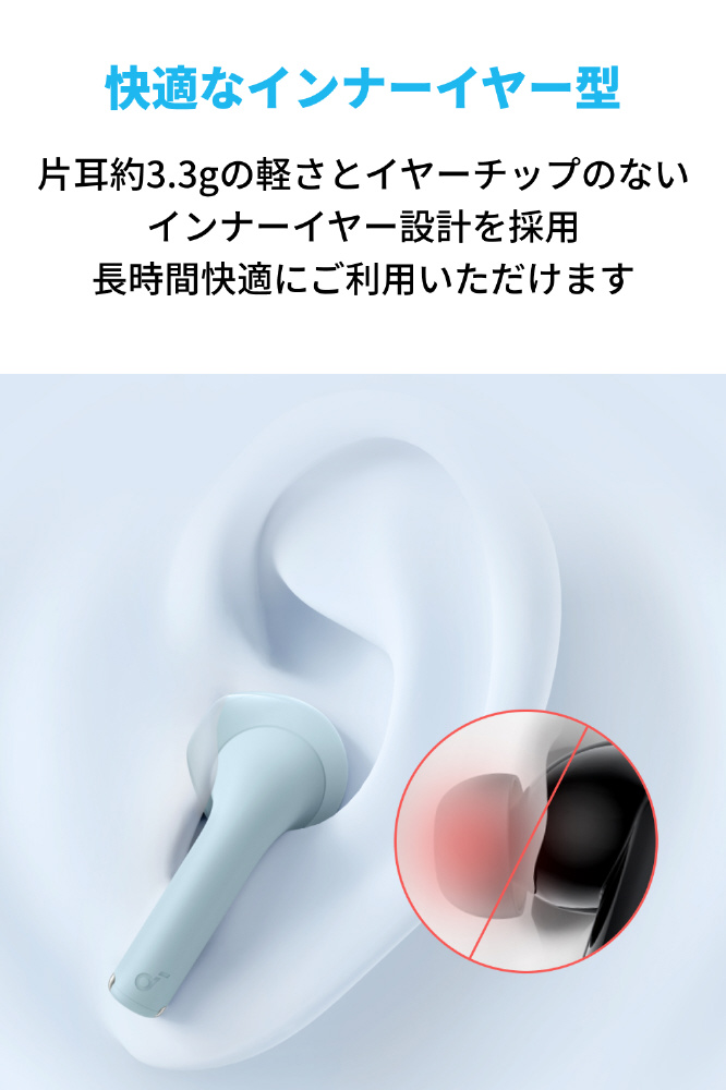 片耳約3.3gの軽さとイヤーチップのないインナーイヤー設計。
