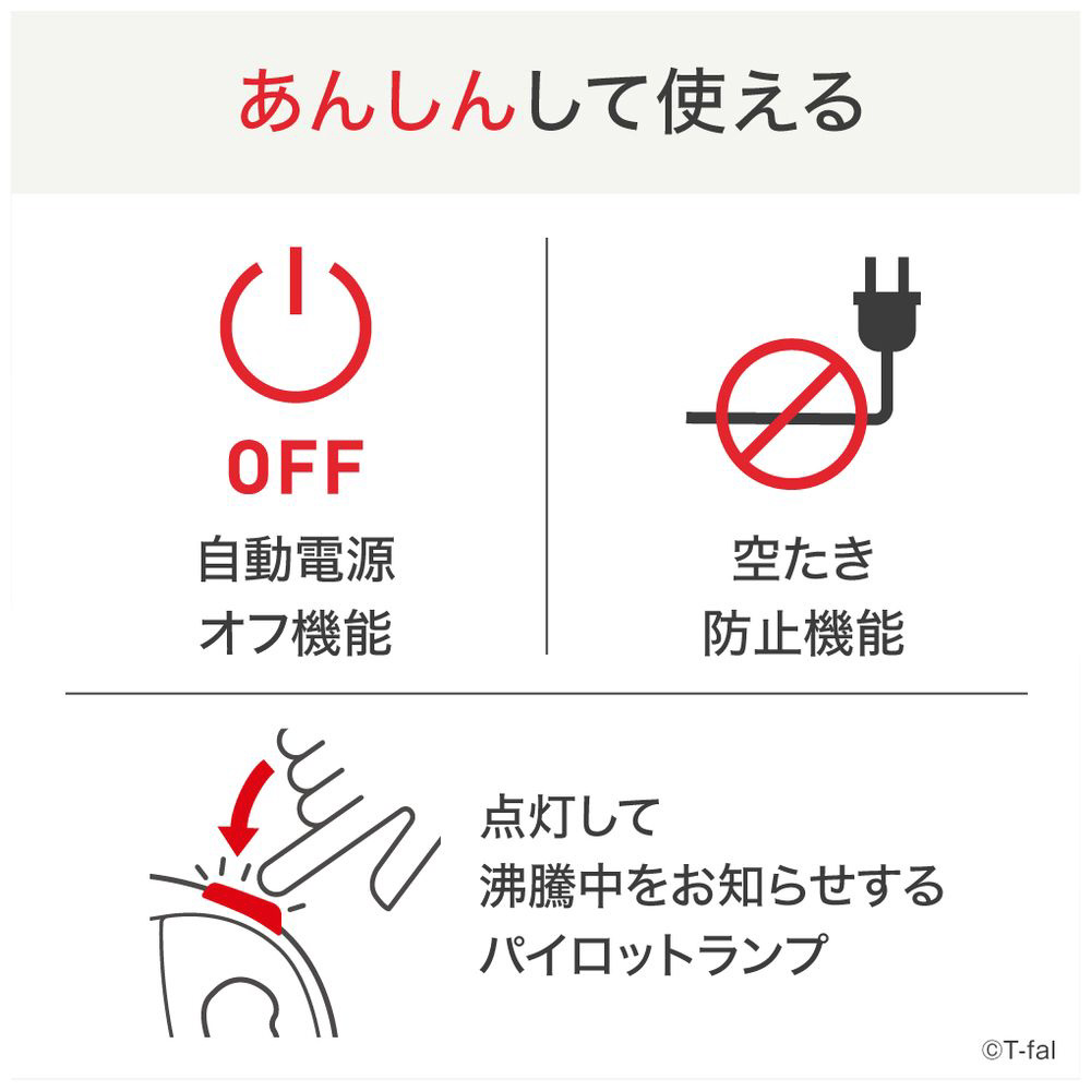 ・省スチーム設計:沸騰時に注ぎ口から蒸気が出にくい構造なので蒸気によるやけどの危険性を少なくします。