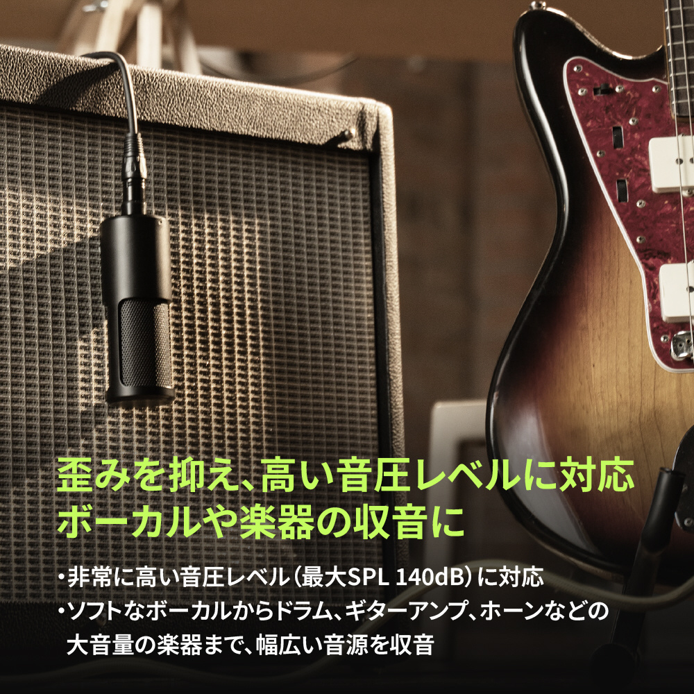 非常に高い音圧レベル(最大SPL 140dB)に対応し、ソフトなボーカルからドラム、ギターアンプ、ホーンなどの大音量の楽器まで、幅広い音源を収音するように最適化されています。