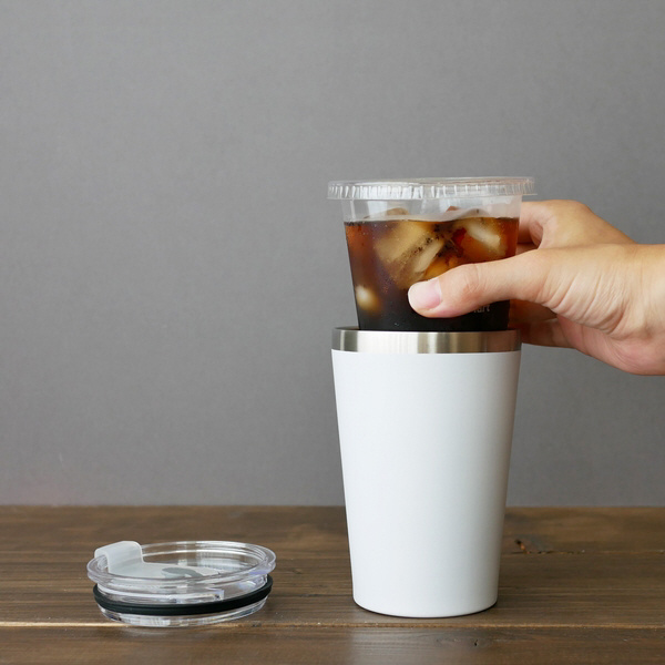 保温・保冷性に優れた真空二重構造のカップインタンブラー。コンビニのコーヒーをカップごと入れておけば美味しい温度が長続き。車のドリンクホルダーにも入り、水滴が垂れないので快適に使えます。