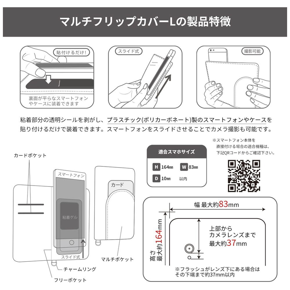 多機種対応の手帳タイプのカバー。ちょっとした時にサッと挟める便利なマルチポケット付き。H164mmW83mm 上部からカメラレンズまで37mmの機種に対応