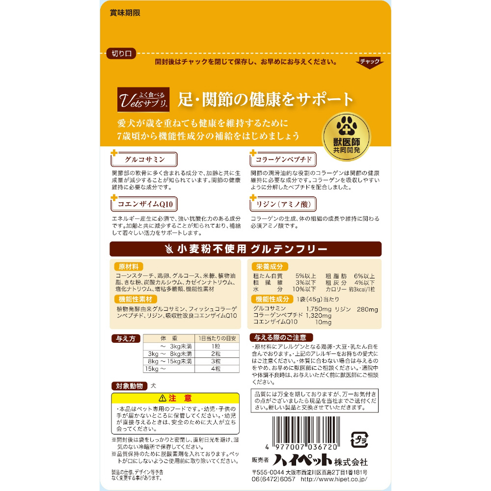| 商品名 | よく食べるVetsサプリ 足・関節健康サポート 45g |
