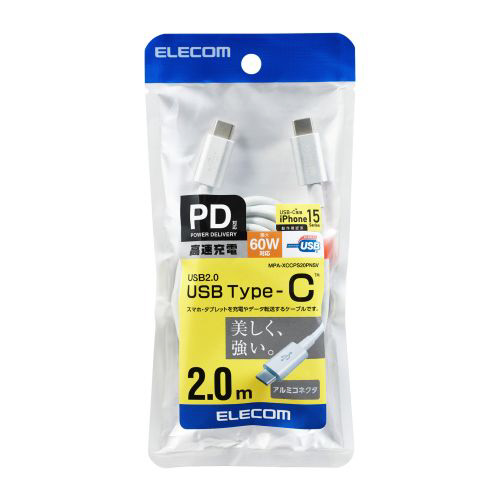 美しく、強い。耐久設計で断線しにくいスリム耐久ケーブルを採用。最大60WのUSB Power Deliveryに対応し、スマートフォン・タブレットを高速充電。USB Type-C(TM)ポートを搭載した機器同士の接続ができるUSB2.0ケーブルです。