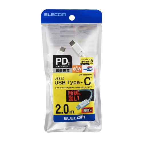 断線に強い高耐久モデル。最大60WのUSB Power Deliveryに対応し、スマートフォン・タブレットを高速充電。USB Type-C(TM)ポートを搭載した機器同士の接続ができるUSB2.0ケーブルです。