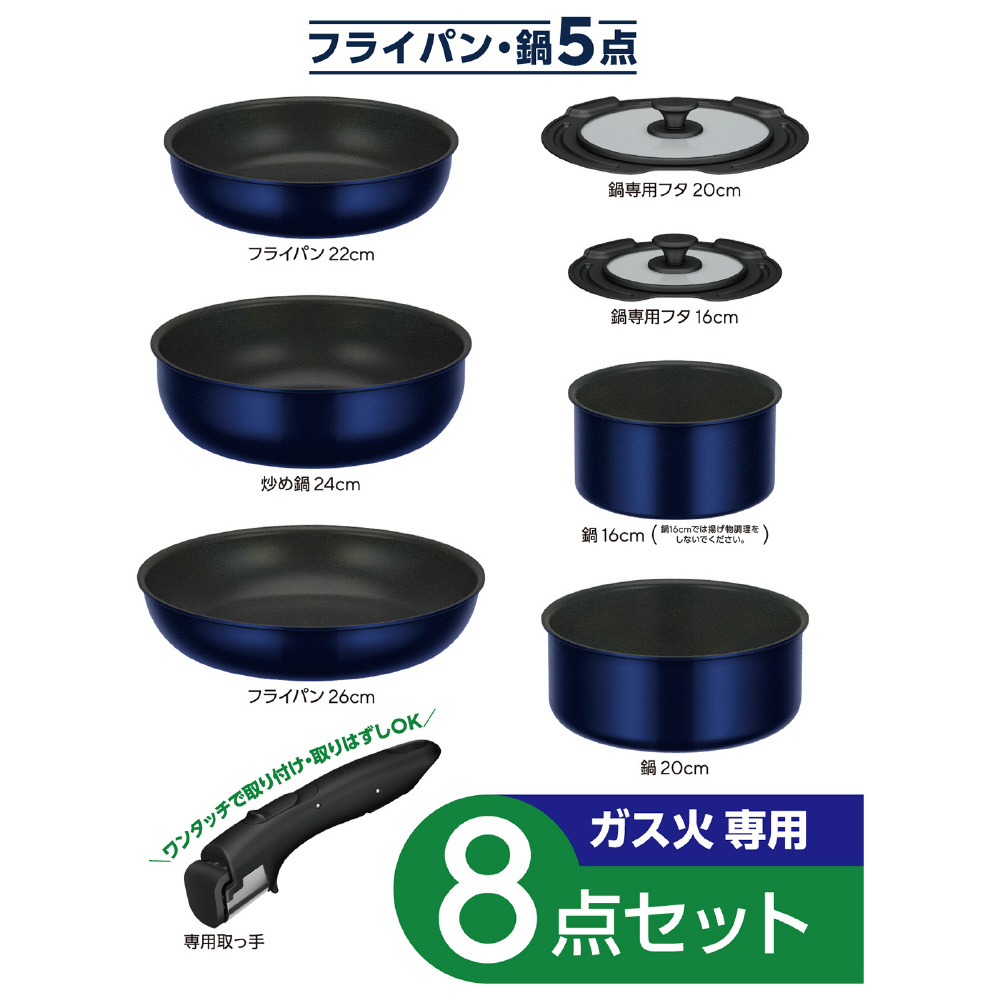 ガス火専用8点セットフライパン。耐久性コーティングで焦げ付きにくく、22cmと26cmフライパン、24cm炒め鍋、16cmと20cm鍋、フタ2種、取手がセット。餃子もつるんと剥がれる!オーブン・食洗機対応(中性洗剤使用)。16cm鍋は揚げ物不可。