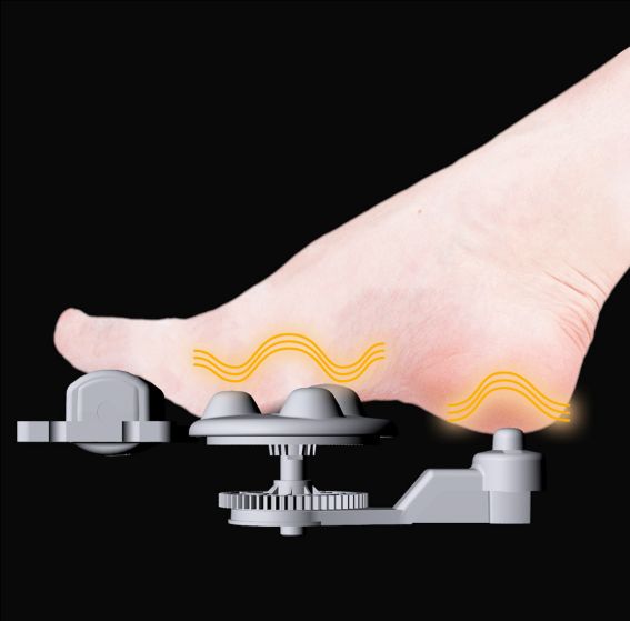 土踏まず・かかとに配置された2か所の突起が、指圧感覚で足裏をぐいぐい刺激します。また、エアーマッサージと足裏ローラーマッサージとのコンビネーションで痛快な「足つぼマッサージ」の体感を実現します。