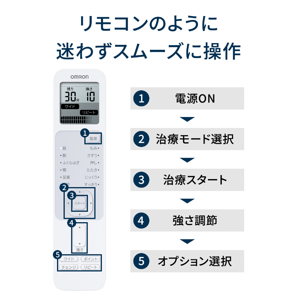 12種類の治療モード×20段階の強さが選べ、お好みの調整が可能です。部位別、もみ方別の各モードの中から選ぶだけで、それぞれに最適な治療をおこないます。治療開始後30分経過すると自動的に電源が切れる「オートパワーオフ機能」も搭載しているので、電源の切り忘れを防ぎます※。