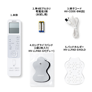 | 付属品 | 導子コード、ロングライフパッド(1組2枚入り)、パッドホルダー、単4形アルカリ乾電池2個(お試し用)、取扱説明書(品質保証書付き) |