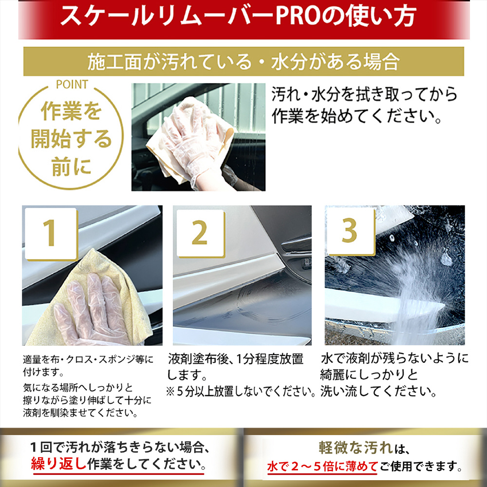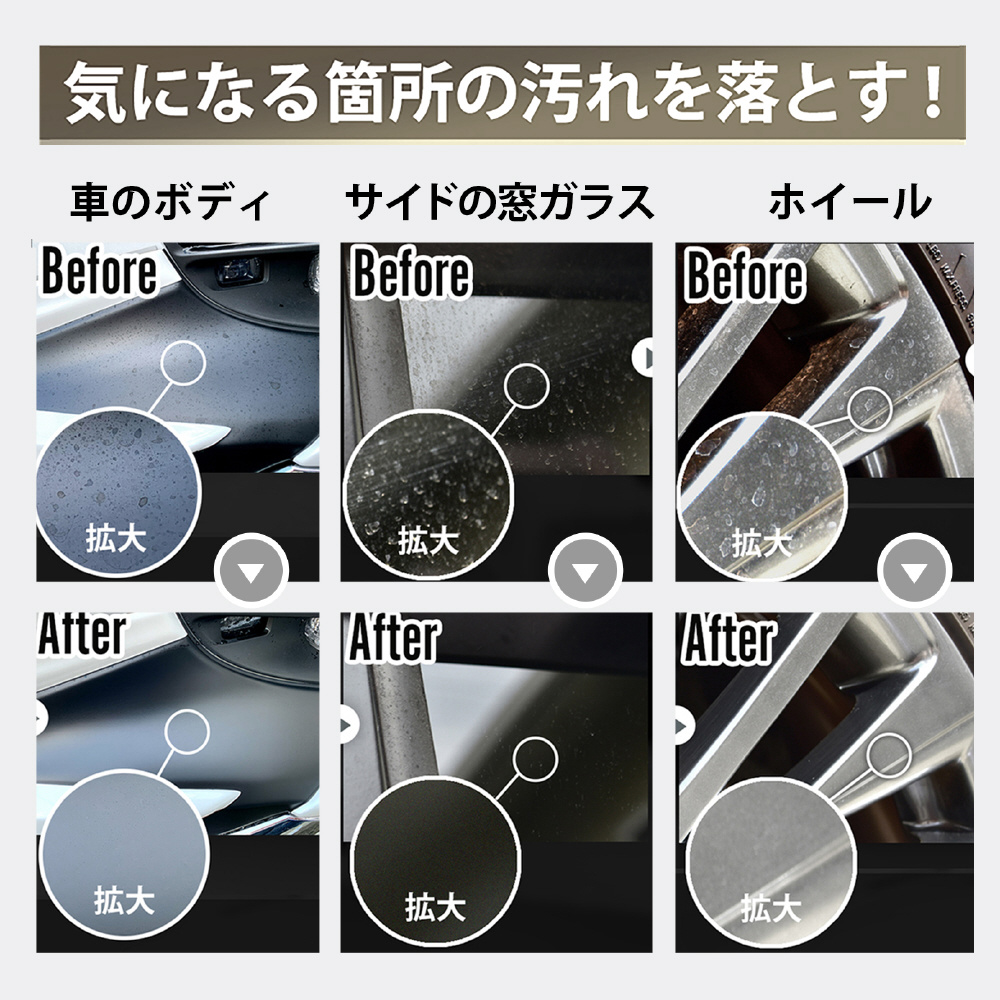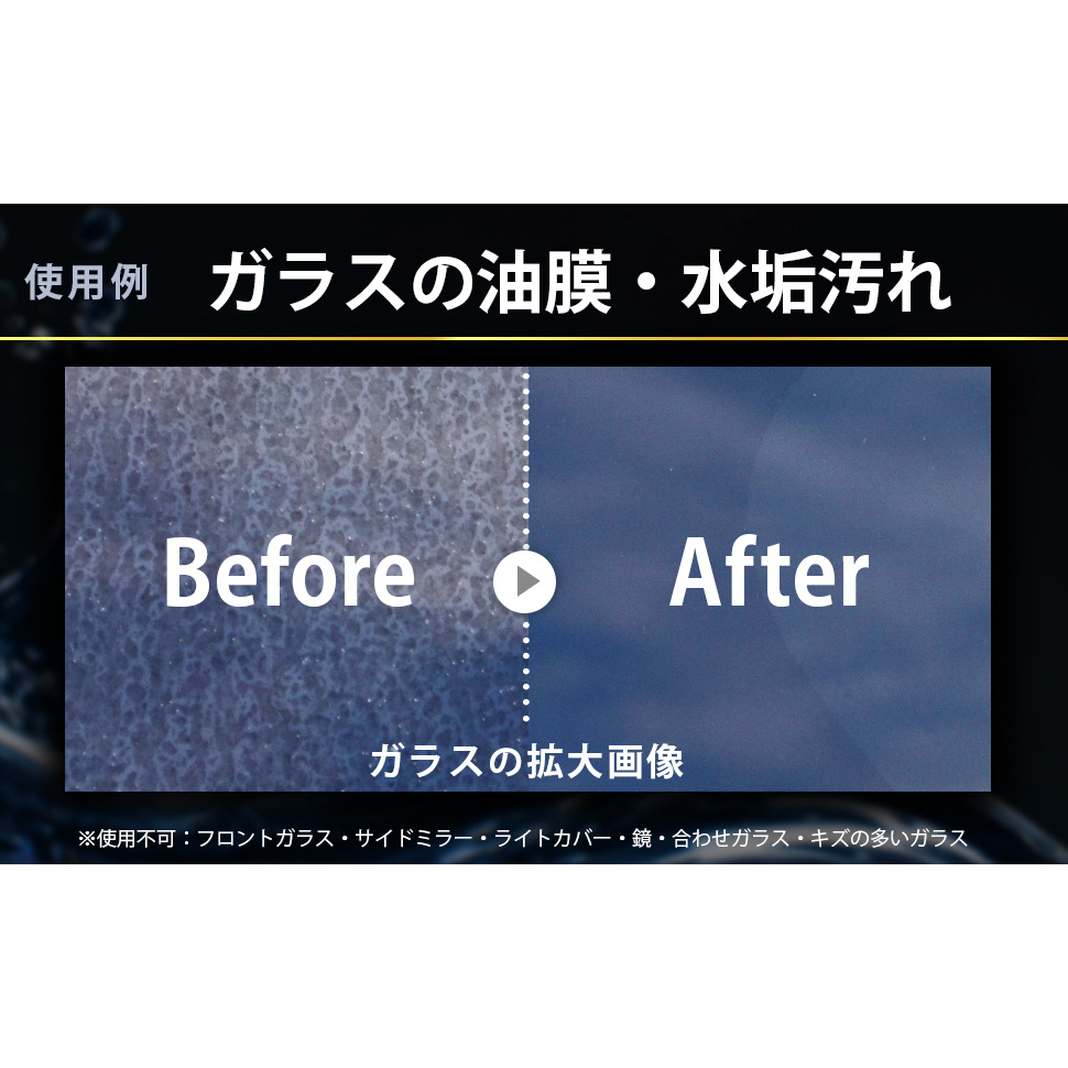 プロ仕様、簡単、時短で使いやすい水垢クリーナー。フロントガラス、サイドミラー、ライトカバー、合わせガラス、鏡には使用できません。