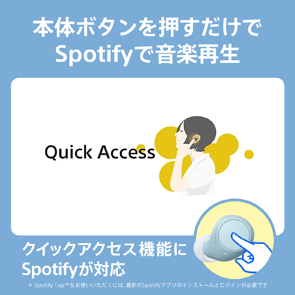 スマートフォンを取り出すことなく、イヤホンの本体タップ操作のみで音楽アプリ(*)の再生/楽曲の切り替えが行えるQuick Access(クイックアクセス)。あなたの音楽ライフをよりシンプルなものにしてくれます。
