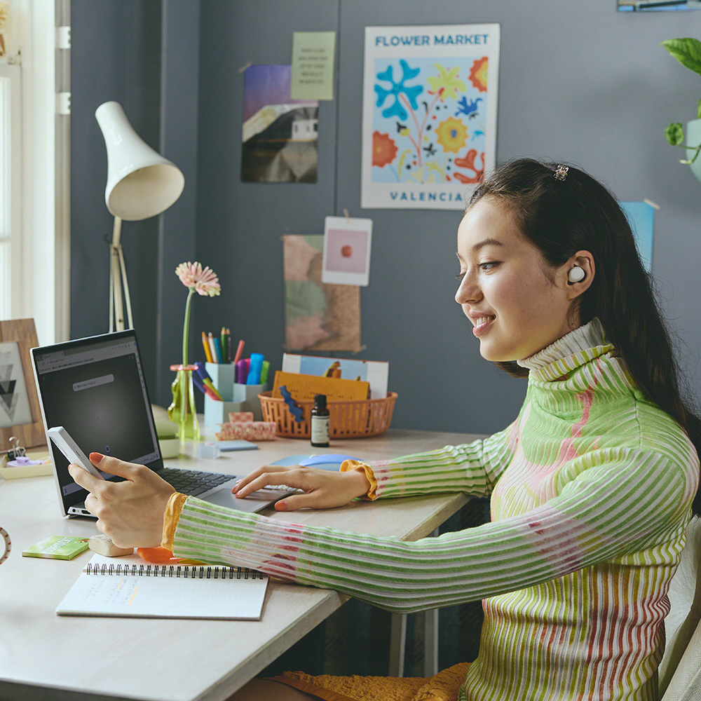 スマートフォンやPC等の機器の中から2台の機器と同時接続し、それぞれで通話も音楽も受信できるマルチポイント接続に対応。例えば、PCでオンライン会議を終了した後、スマートフォンで音楽再生を始めるだけで再生機器を切り替えられます。スマートフォンが電話を着信した際には自動でスマートフォンの通話に切り替わり、そのままハンズフリー通話をすることも可能。2台の機器でヘッドホンを使う場面で接続の切り替えがいらず、快適にご使用いただけます。