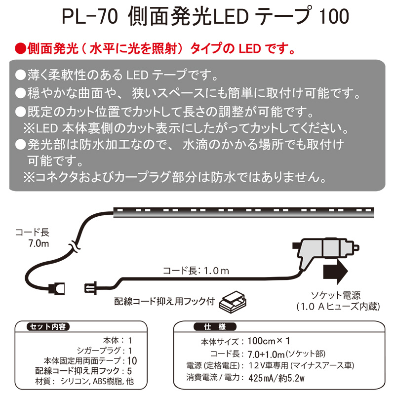 粘着テープ付。12V車専用。ソケットタイプ。ON/OFFスイッチ付。防水仕様。