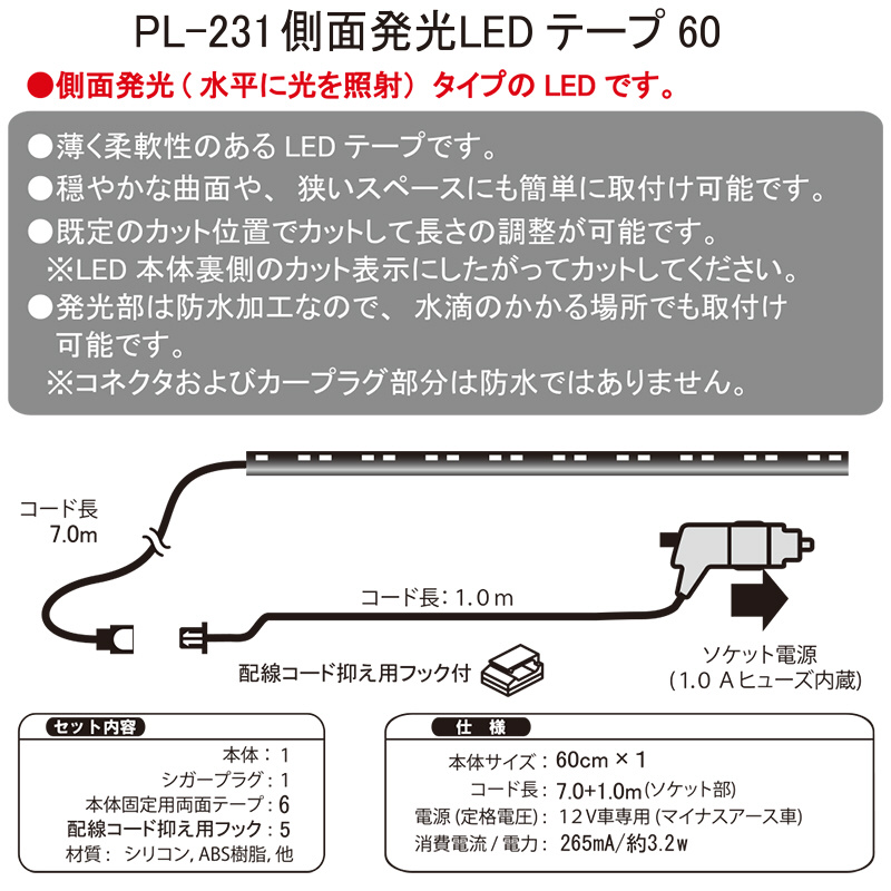粘着テープ付。12V車専用。ソケットタイプ。ON/OFFスイッチ付。防水仕様。