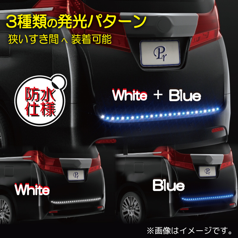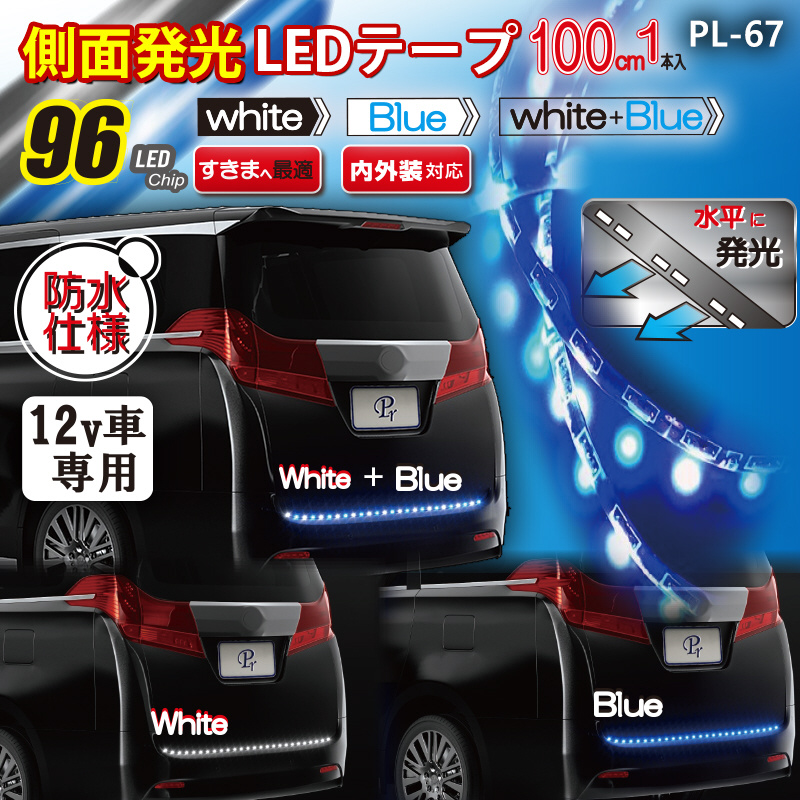 側面発光LEDテープ。すきまへ最適。内外装対応。3種類の発光パターン。白、青、白+青の光が水平に発光します。