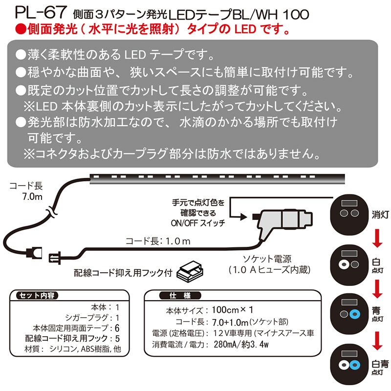 粘着テープ付。12V車専用。ソケットタイプ。ON/OFF色切替えスイッチ付。防水仕様。