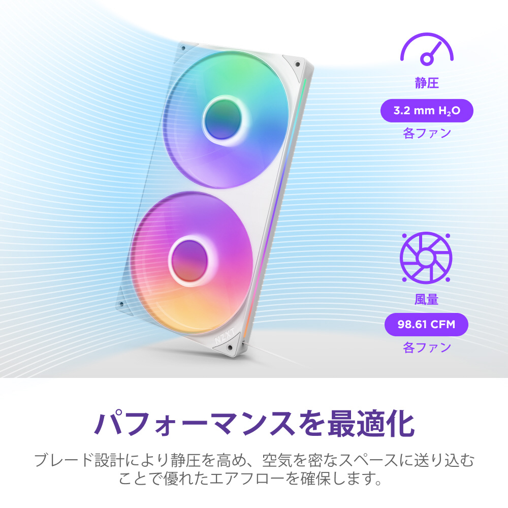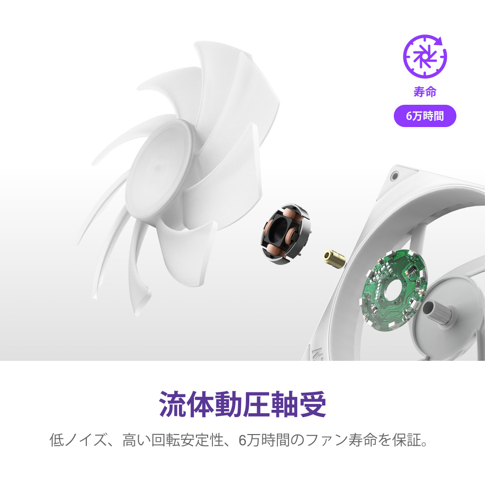 複数のファンがひとつのフレームに収められた「シングルフレーム」構造を採用。シームレスで美しいデザイン、組み立てやケーブルマネジメントの利便性を向上させた革新的なファンです。