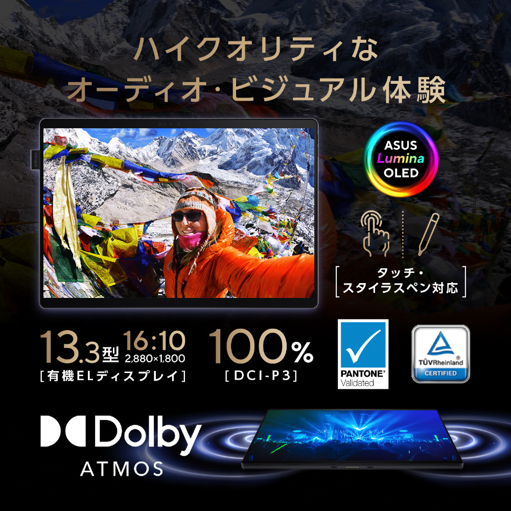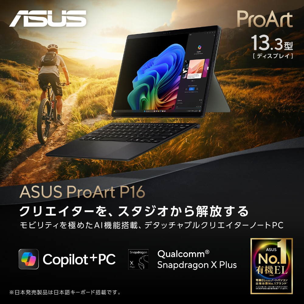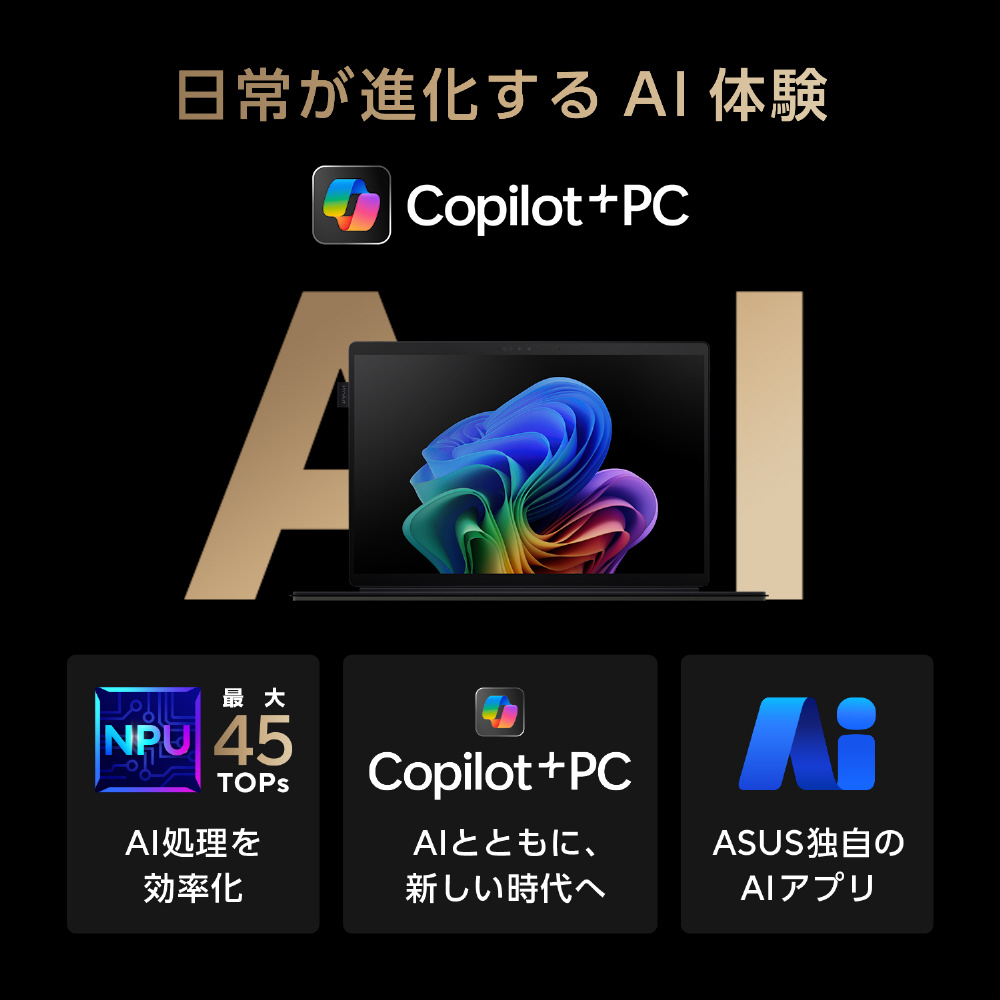 着脱式のキーボードとタッチ・スタイラス入力により様々なスタイルに適応します。ミリタリーグレードをクリアする堅牢性を保ちながら軽量設計を実現。ASUS独自のAI機能を備え、初めてのCopilot+ PCとしても最適です。