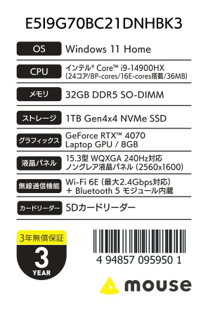 E5I9G70BC21DNHBK3 ゲーミングノートパソコン G-Tune(RTX 4070) [15.3型 /Windows11 Home /intel Core i9 /メモリ:32GB /SSD:1TB /無し /日本語版キーボード]