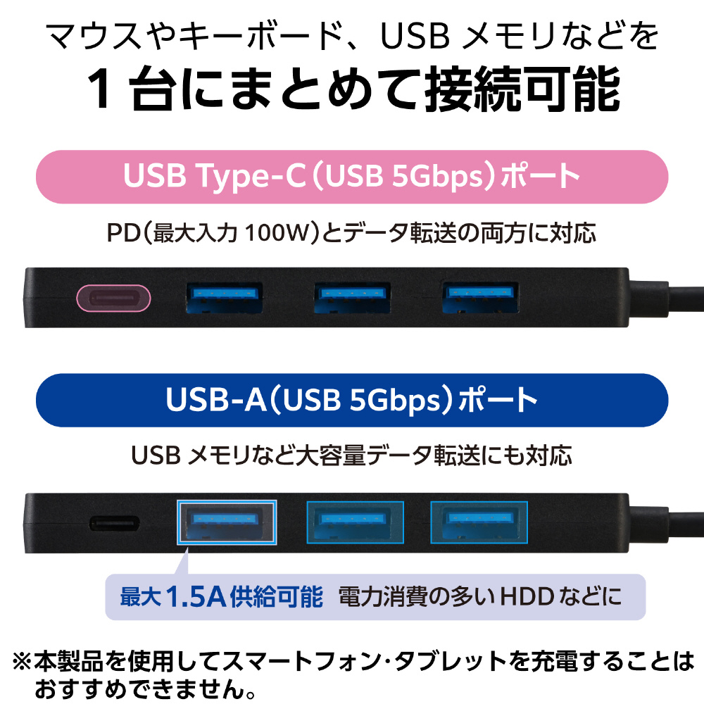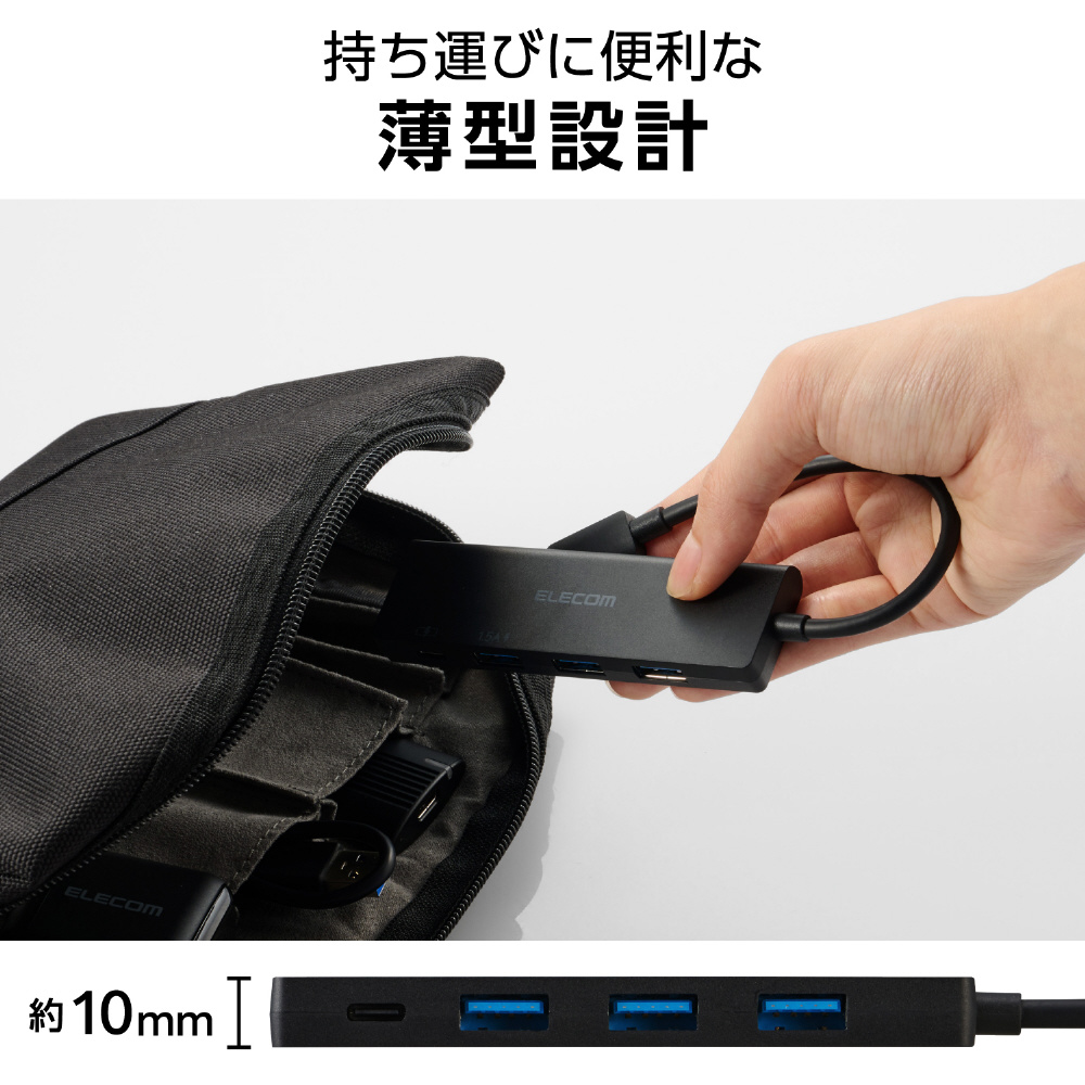 USB-Aポートを増やしてデスクまわりをすっきり。3つのUSB-AポートとUSB Power Delivery対応USB Type-C(TM)ポートを搭載した、USB Type-C接続のUSBハブです。USB 5Gbps(USB3.2(Gen1))で高速データ転送が可能です。
