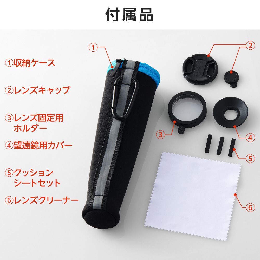 | 仕様2 | ■付属品:ホルダー、収納ポーチ、レンズキャップ、レンズ固定用ホルダー(機器本体用)、レンズ固定用ホルダー(アクセサリー取り付け用)、望遠鏡用カバー、レンズクリーナー |