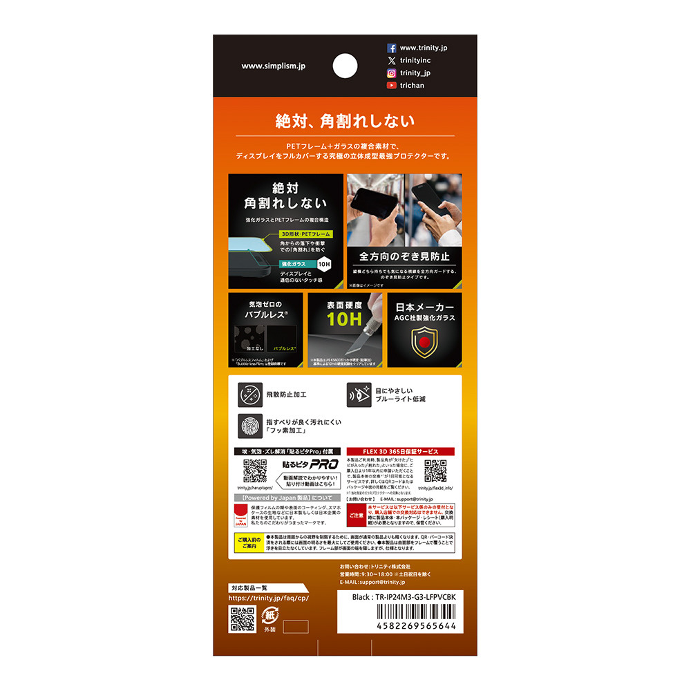 角割れしない AGC社製強化ガラス採用 PETフレーム 立体成型プロテクター 360度のぞき見防止