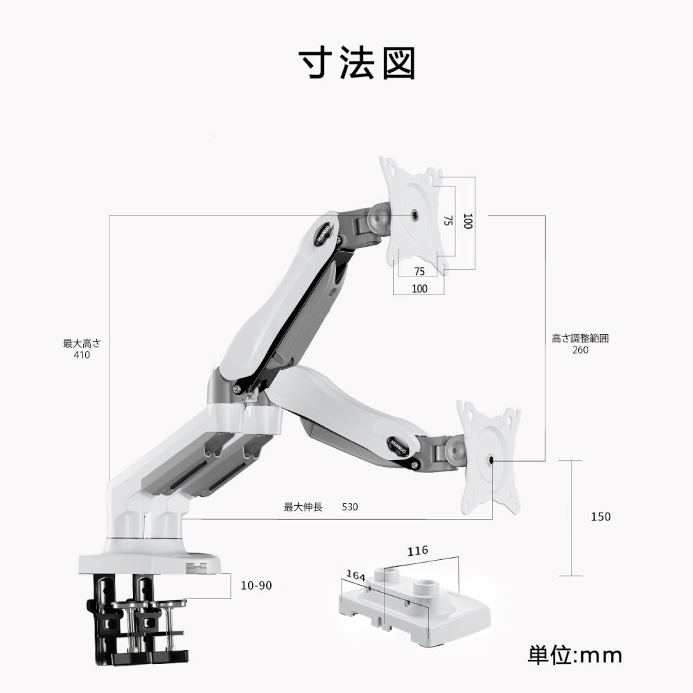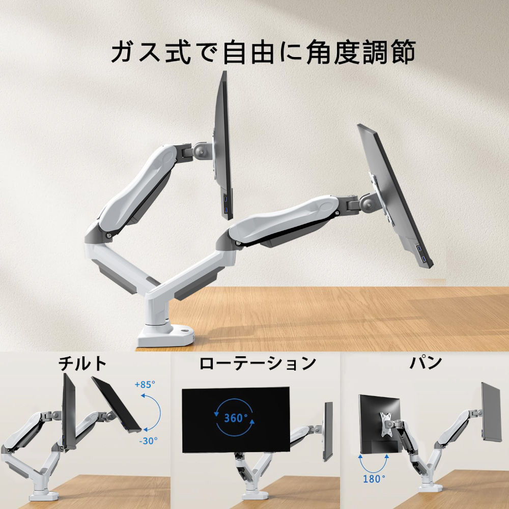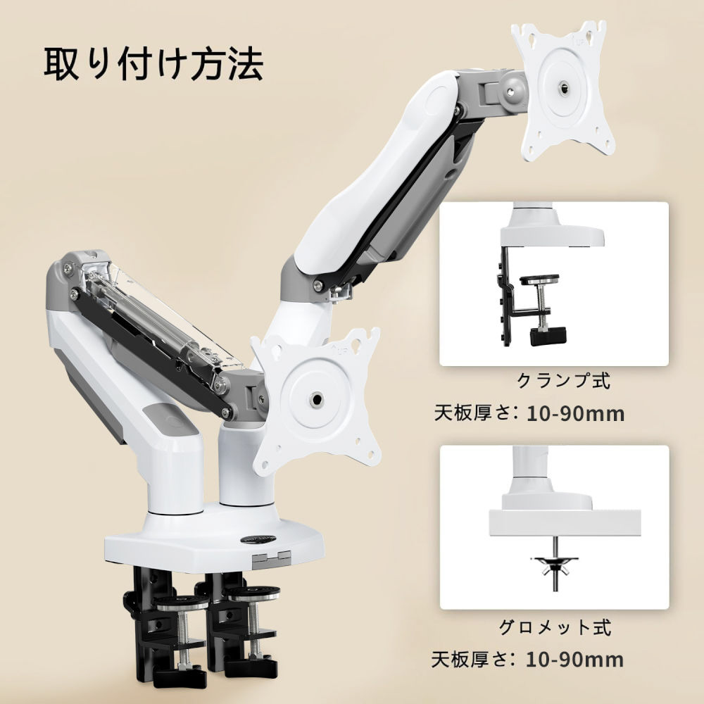ガススプリング式のデュアル対応モニターアーム。デスクへの固定はクランプ式、グロメット式どちらにも対応しています。