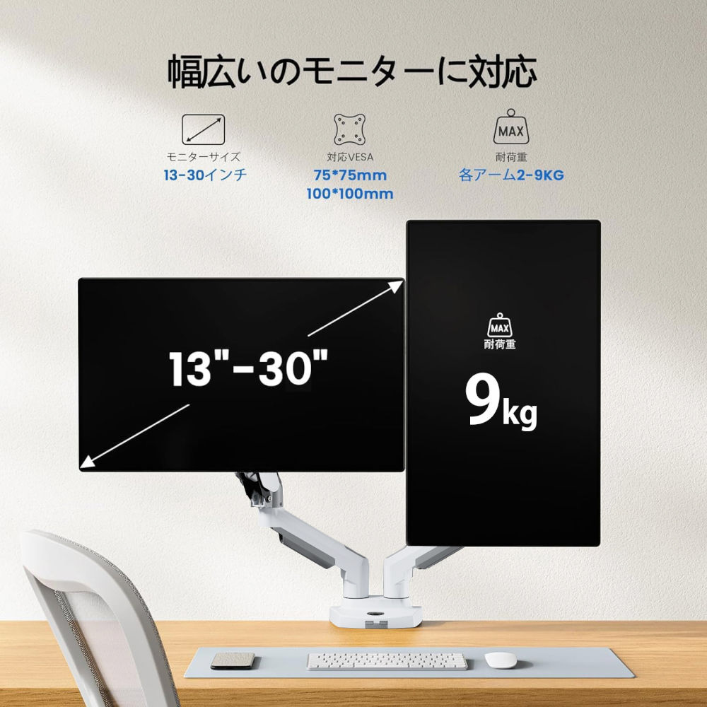 モニターアーム [2画面 /13〜30インチ] ガススプリング式 ホワイト HNDS31W