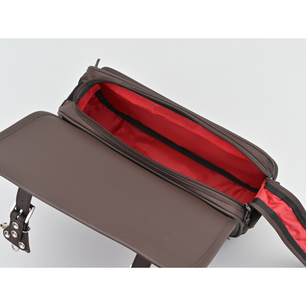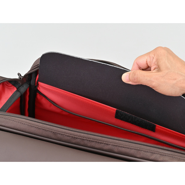 ライダースジャケットをイメージした赤い裏地。書類や小物の収納に便利なファスナーポケットを装備。