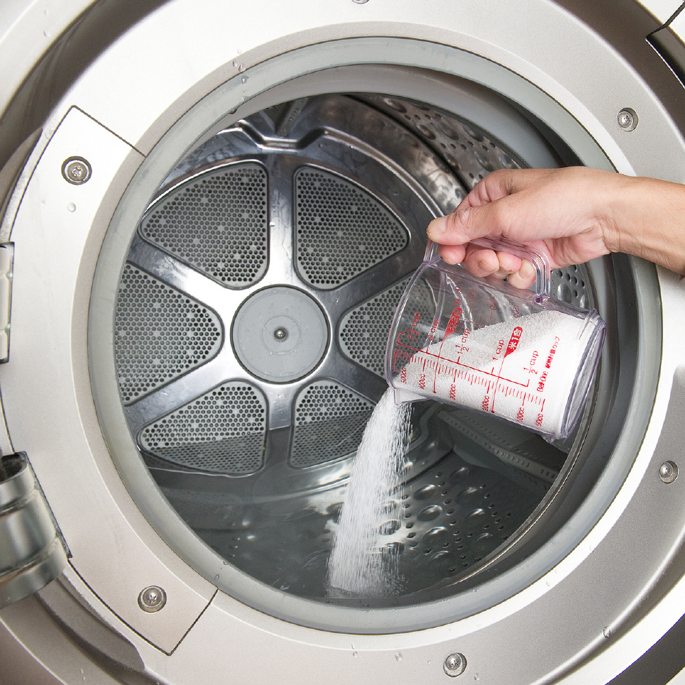 3.本品1袋をドラム内に入れ、運転を始める。泡立ちすぎて泡消し機能が働いたら「洗濯槽洗浄コース利用」のときと同じように対応する。