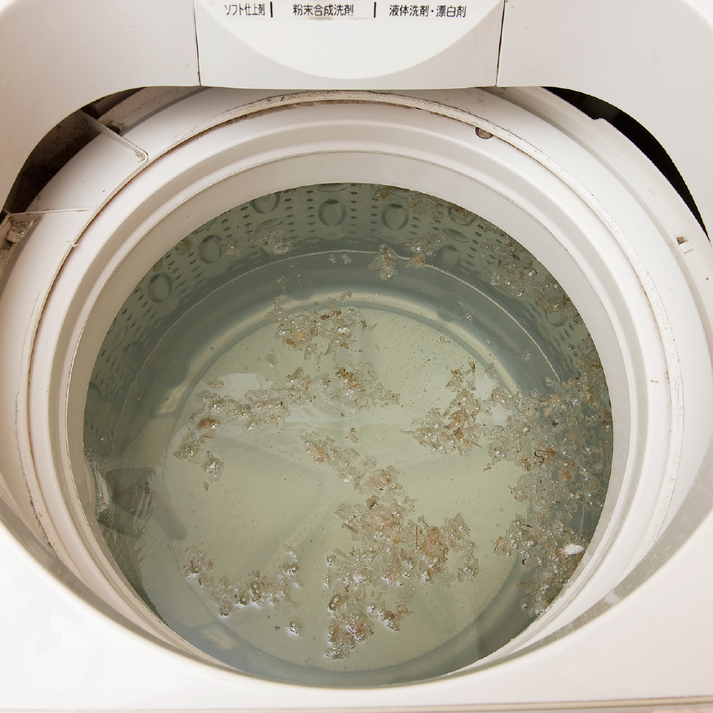 4.「洗い」が終わったら手順2〜3を繰り返し、1時間程度洗浄する。 5.洗浄が終わったらドアを開け、黒カビや汚れを網ですくい取る。 洗浄途中でも、汚れが沢山浮いてきたときは適宜すくい取る。