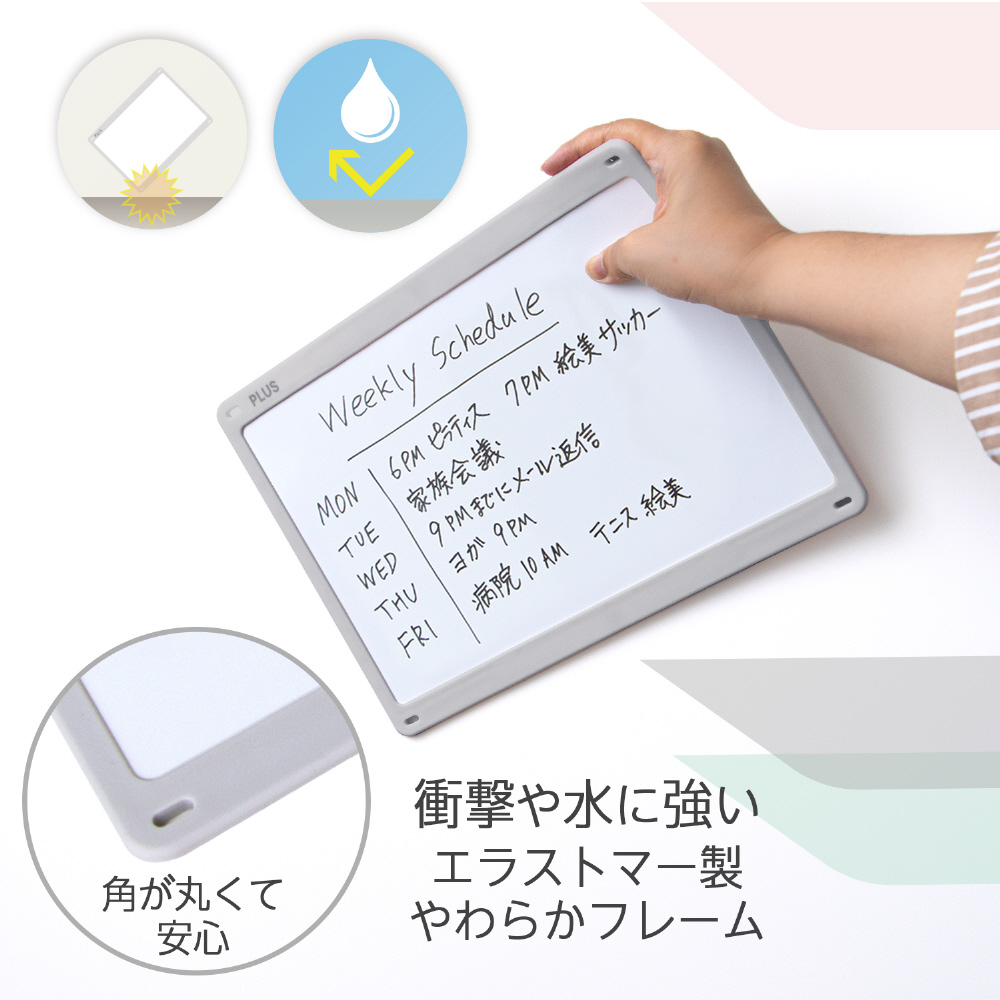 インテリアに馴染む! 従来にはない柔らかな質感とデザイン、根強い人気のくすみカラーのホワイトボード。フレーム材として柔らかなエラストマー素材を採用したグリーン・ピンク・グレーの3色展開。