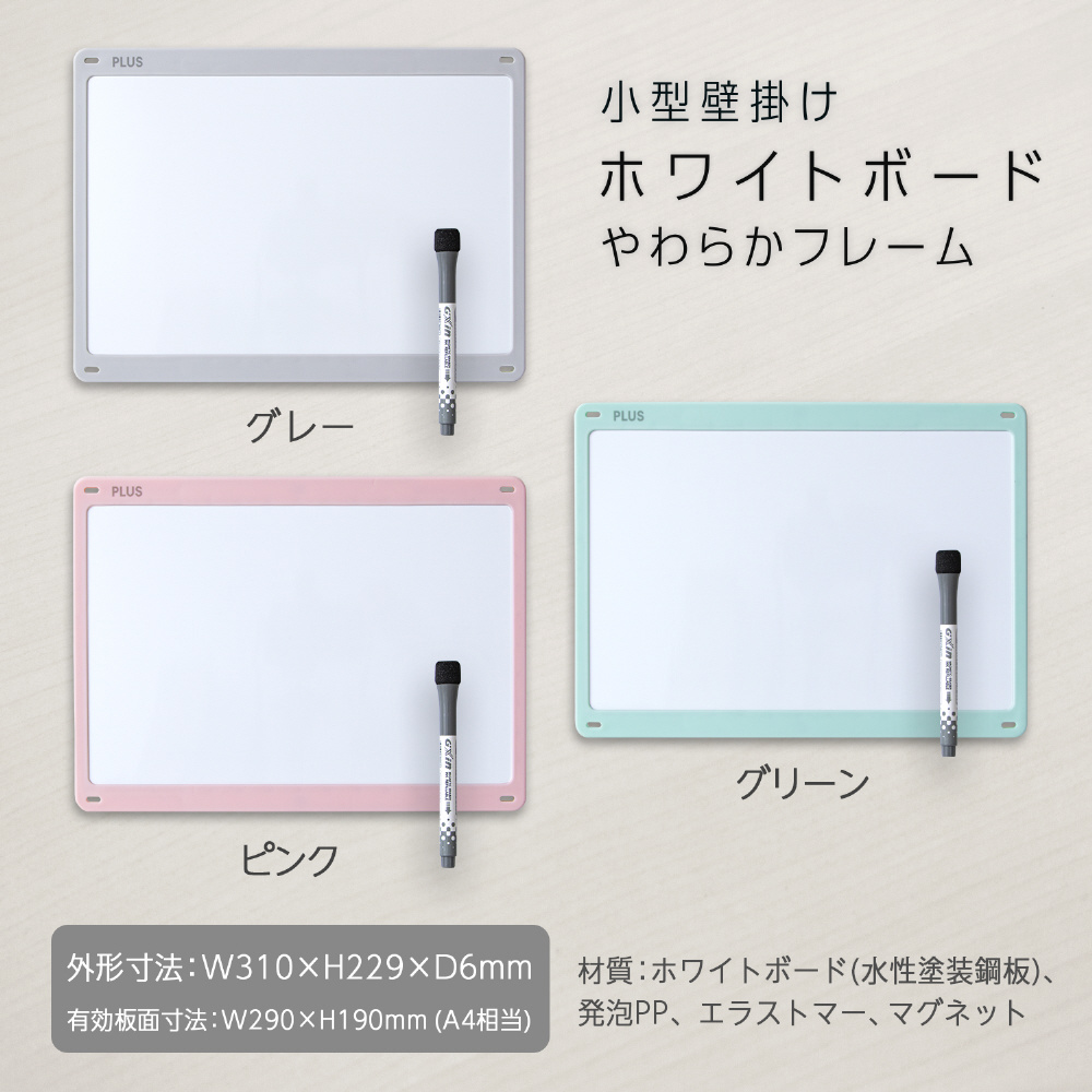 インテリアに馴染む! 従来にはない柔らかな質感とデザイン、根強い人気のくすみカラーのホワイトボード。フレーム材として柔らかなエラストマー素材を採用したグリーン・ピンク・グレーの3色展開。