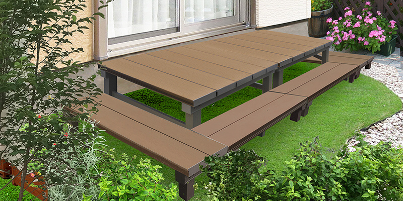旭興進オリジナルの人工木材を使用した「人工木アルミデッキ T型用ステップ」は
