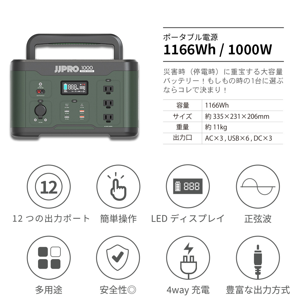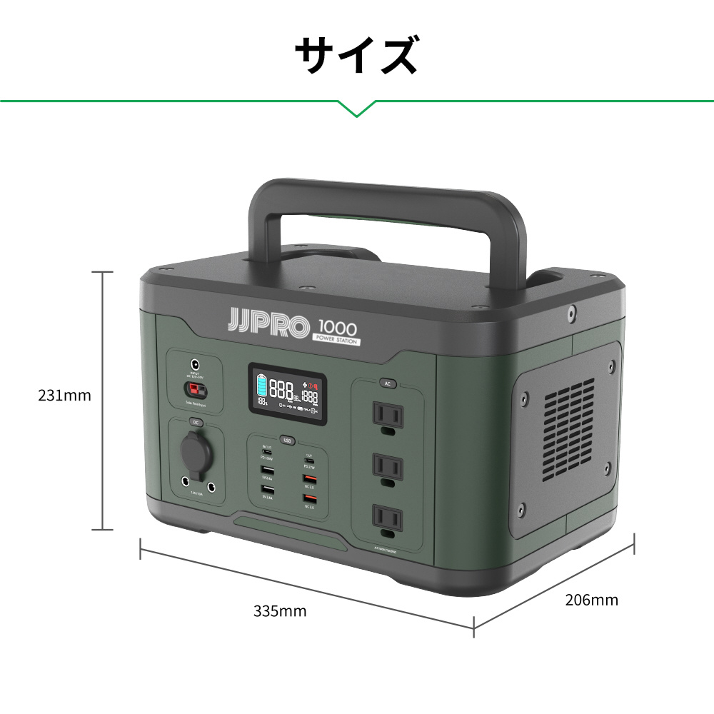 | 商品名 | JJPRO ポータブル電源1000 [リチウムイオン電池 /10出力 /DC・USB-C充電 /USB Power Delivery対応] |