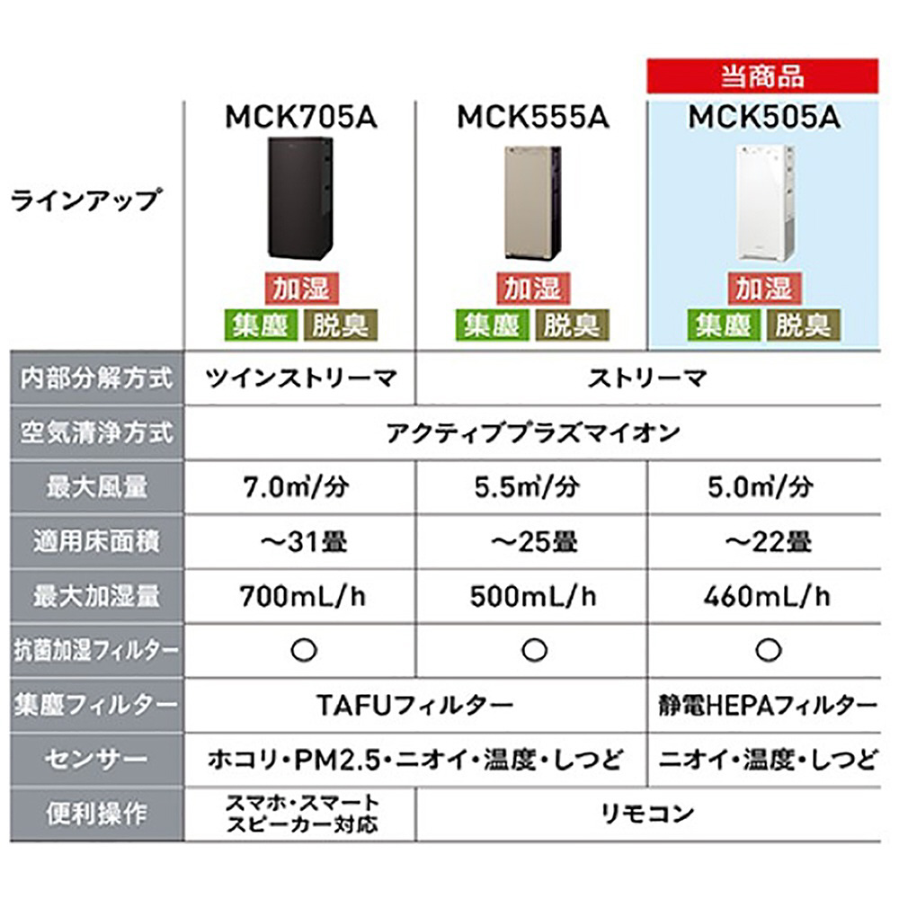 | 商品名 | 加湿空気清浄機 ホワイト MCK505A-W [適用畳数:22畳 /最大適用畳数(加湿):13畳/PM2.5対応] |