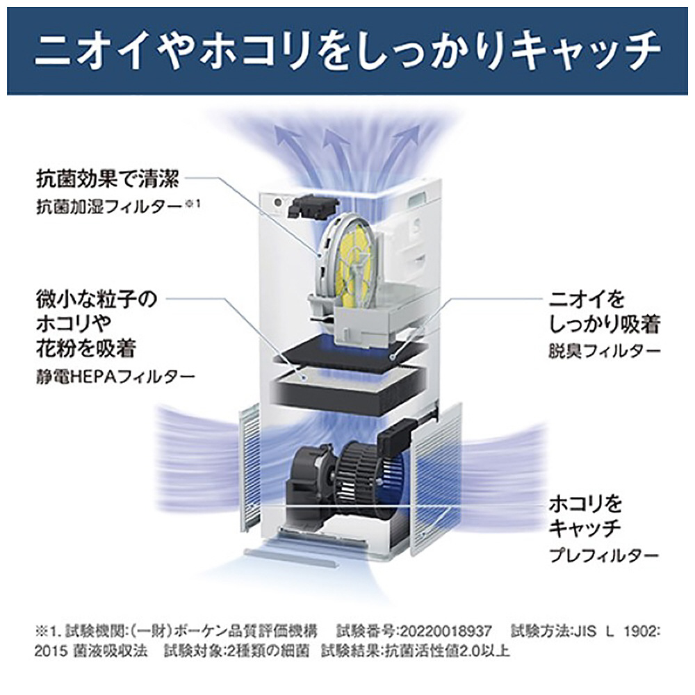 ※浮遊ウイルス・浮遊カビ:25?(約6畳)の密閉した試験空間による効果であり、実使用空間での実証結果ではありません。日本電機工業会規格JEM1467に基づく試験方法にて実施。