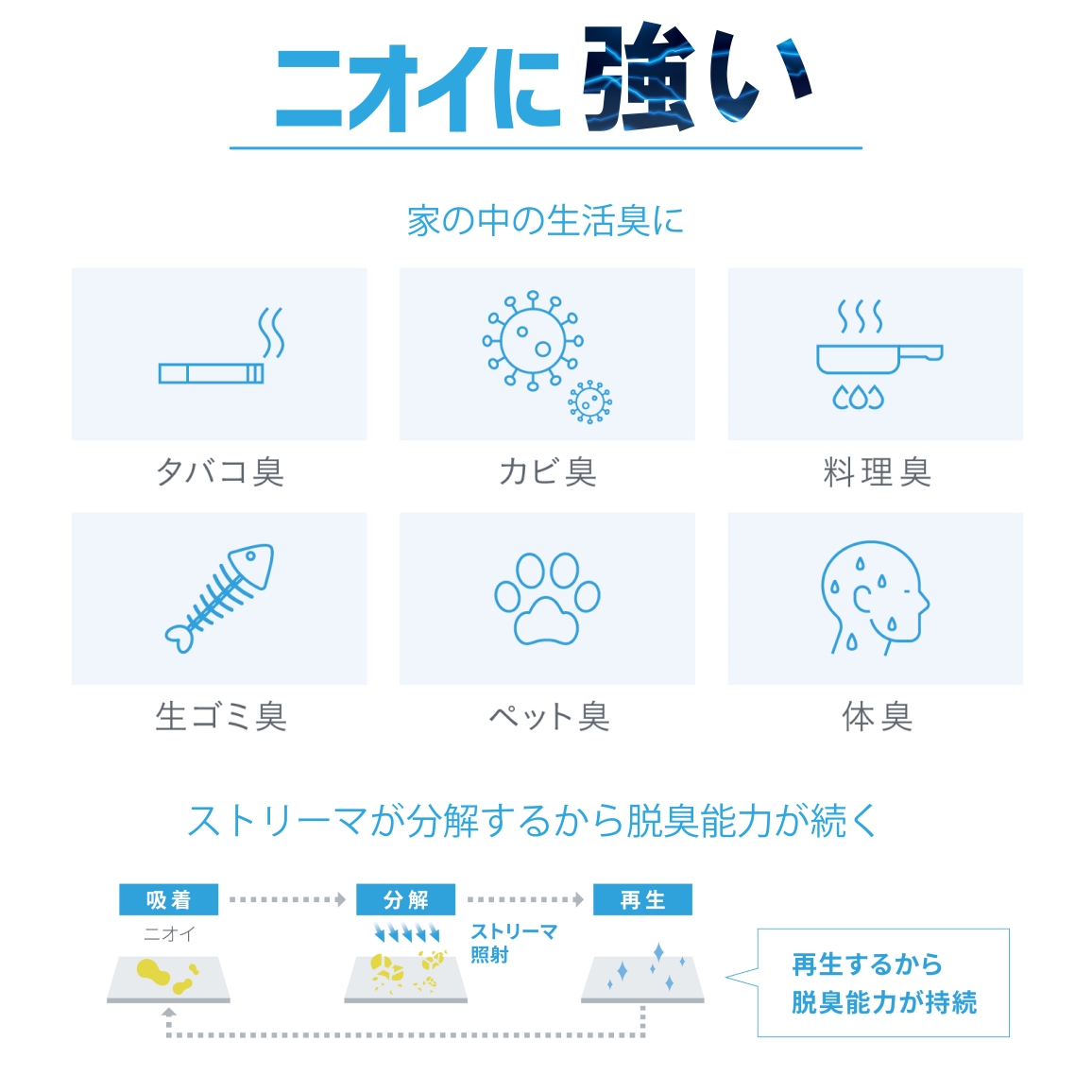 ニオイをフィルターに吸着させて、ストリーマで分解。しかも吸着能力が再生するので、脱臭能力が持続します。