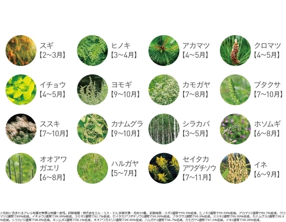 ※花粉に含まれるアレル物質を無害な物質へ変性。試験機関:株式会社エル・エス・エル。試験対象:花粉16種。